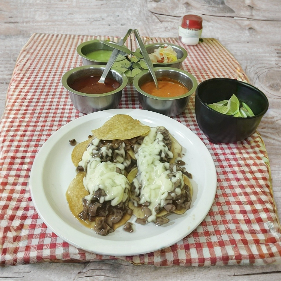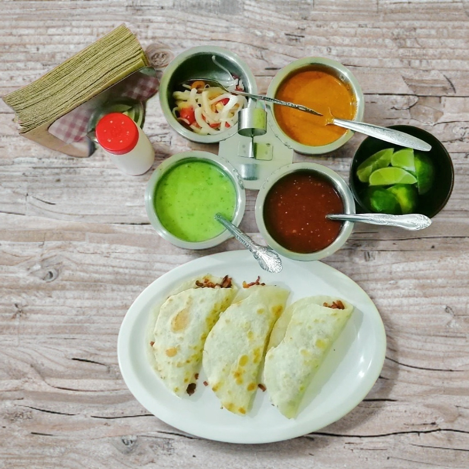 Deliciosa tortilla de harina doblada, rellena de carne de pastor y queso derretido. Incluye salsa y limón para darles el toque perfecto.