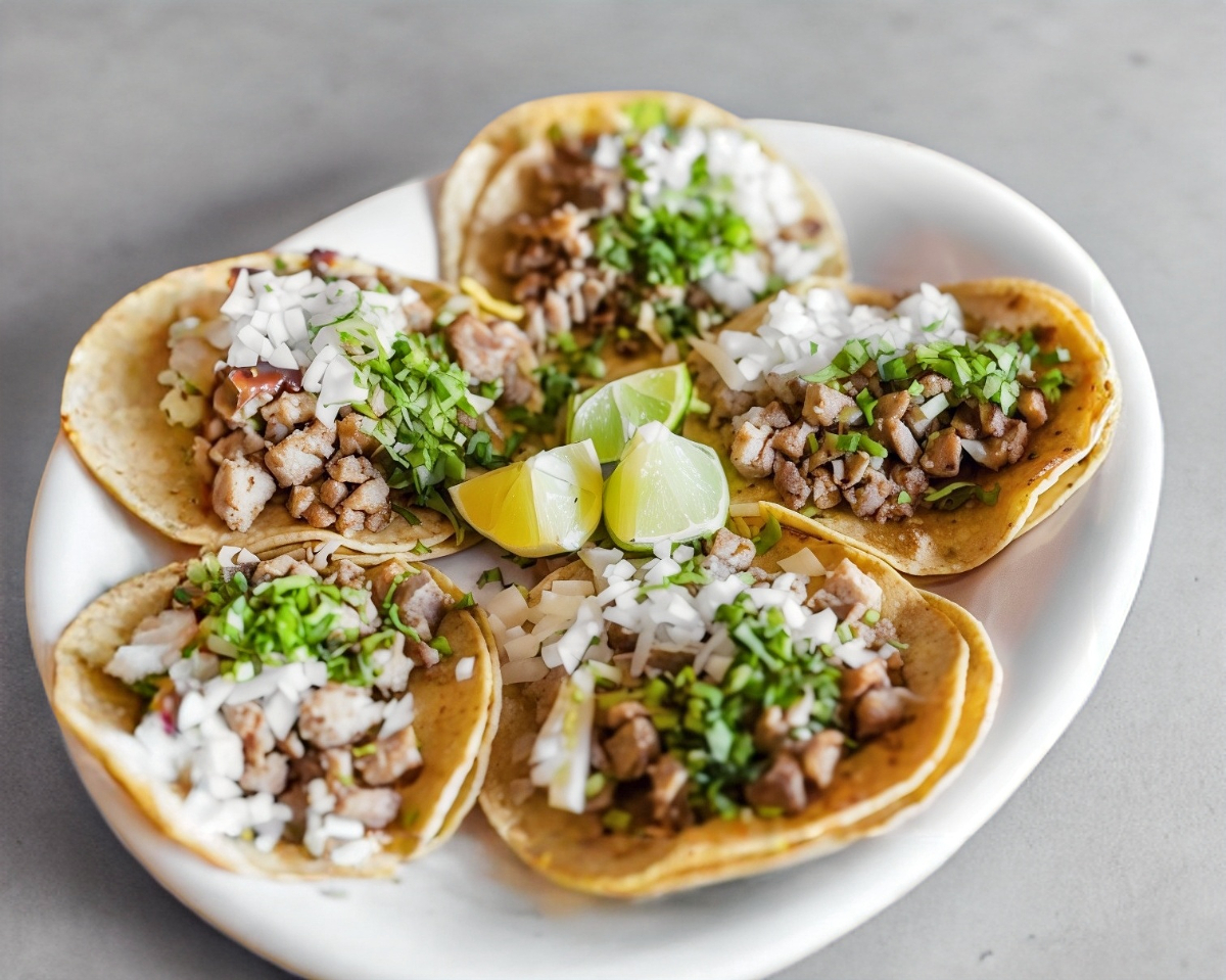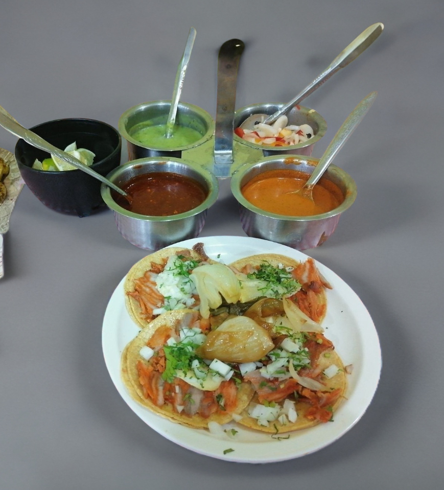 taco, Doble tortilla de maíz con jugosa carne de puerco marinada. Incluye salsa Se envían dos (Salsa roja, salsa de cacahuate) Verduras (Cilantro ,cebolla )y limón por separado para un sabor auténtico y delicioso.