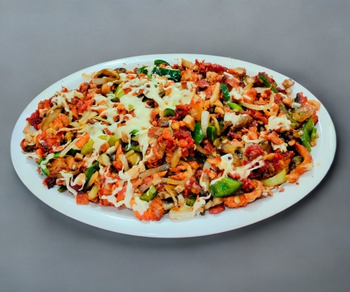 Pastor, bistec, chuleta, Chorizo, morrón, champiñones, cebolla y queso gratinado