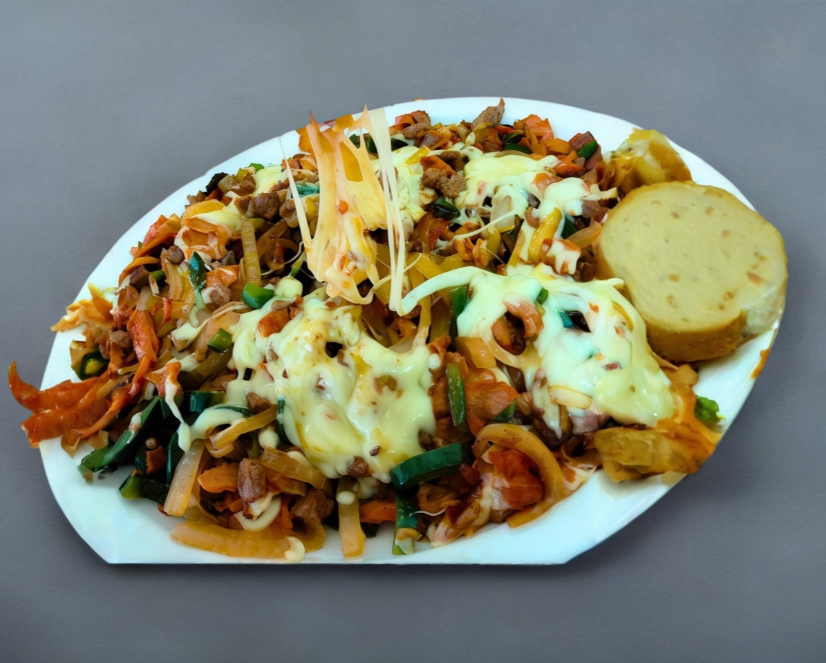 Bistec, morrón, cebolla y queso gratinado