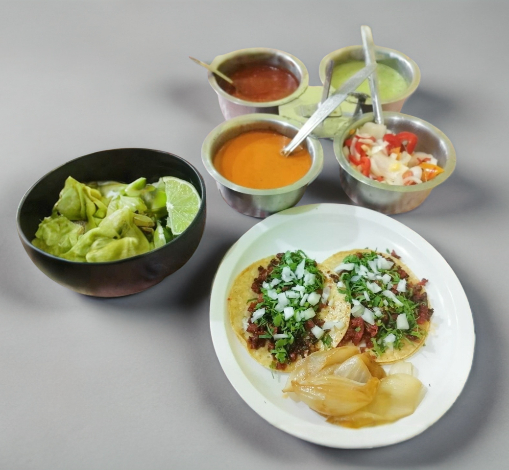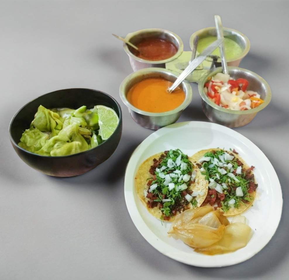 Carne, tortilla, tostadas, ensalada(lechuga, aguacate, jitomate, cebollita, nopales)