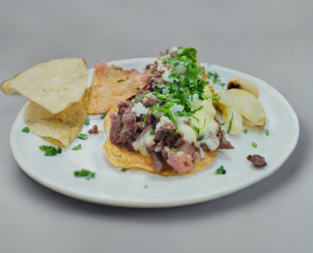Carne (bistec, Chorizo) en tostada con queso gratinado