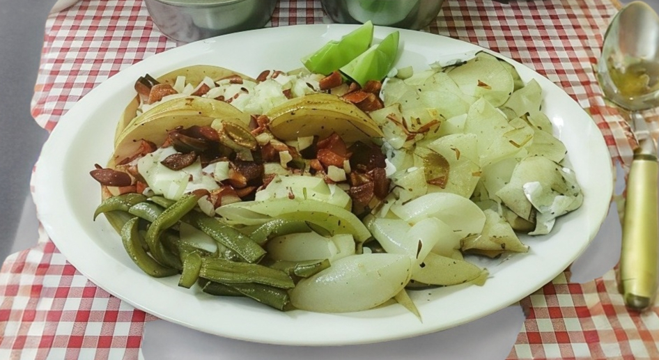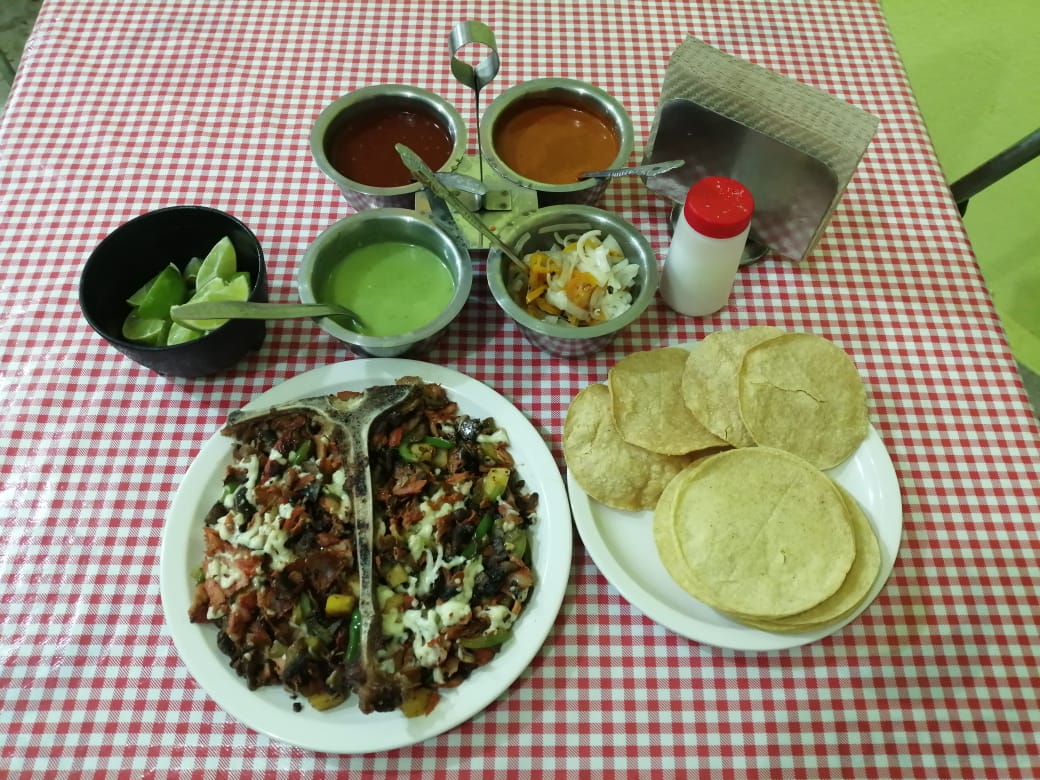 Carne, tortilla, tostadas,ensalada (lechuga, aguacate, jitomate, cebollita, nopales)