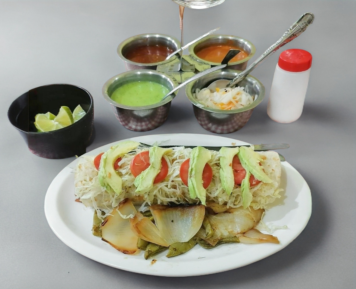 Tortilla burrera, carne, ensalada (lechuga, aguacate, jitomate, cebollita, nopales) y queso