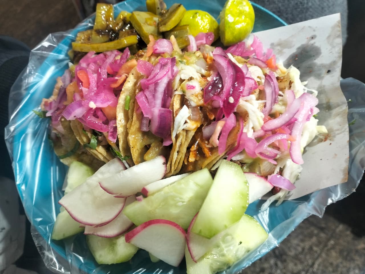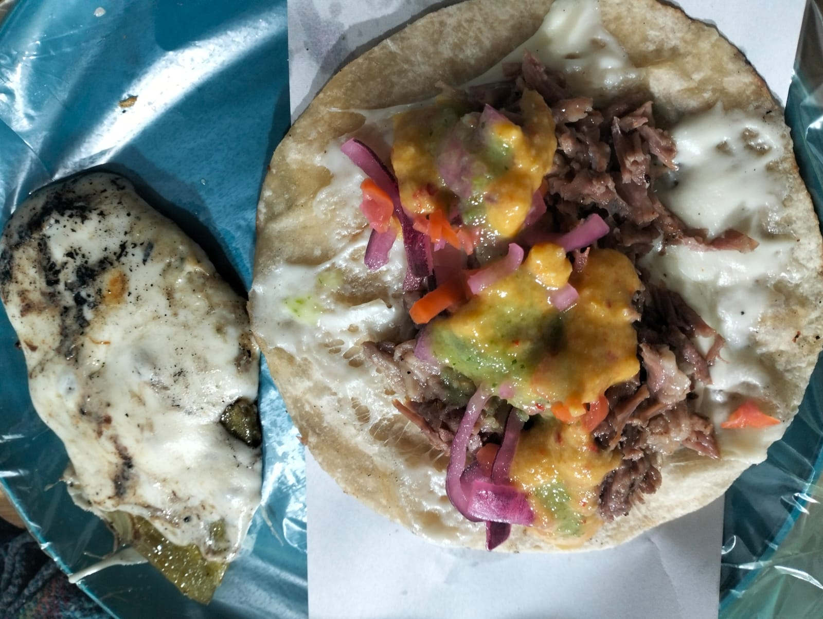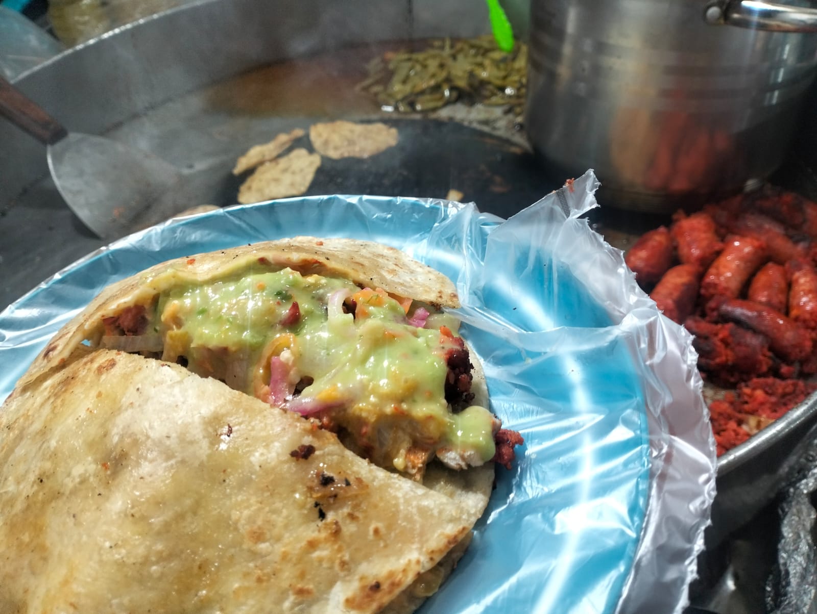 Tortilla de harina rellena de carne al pastor y queso derretido. Se cocina en el comal hasta que la tortilla está dorada y el queso fundido, formando una especie de quesadilla.