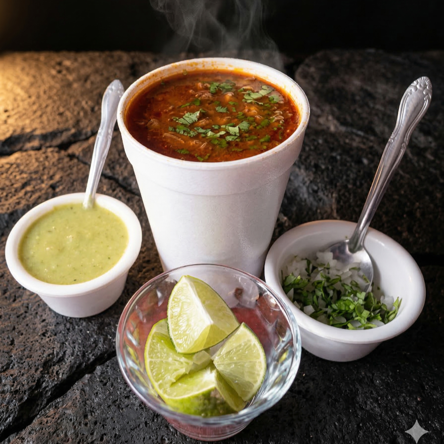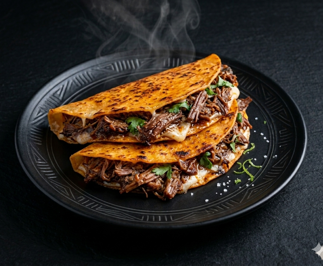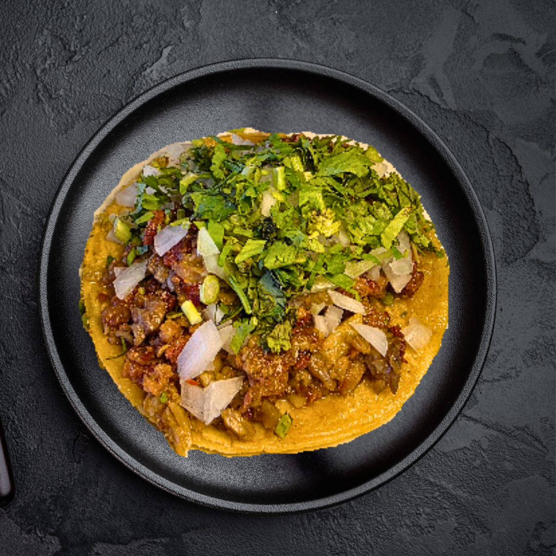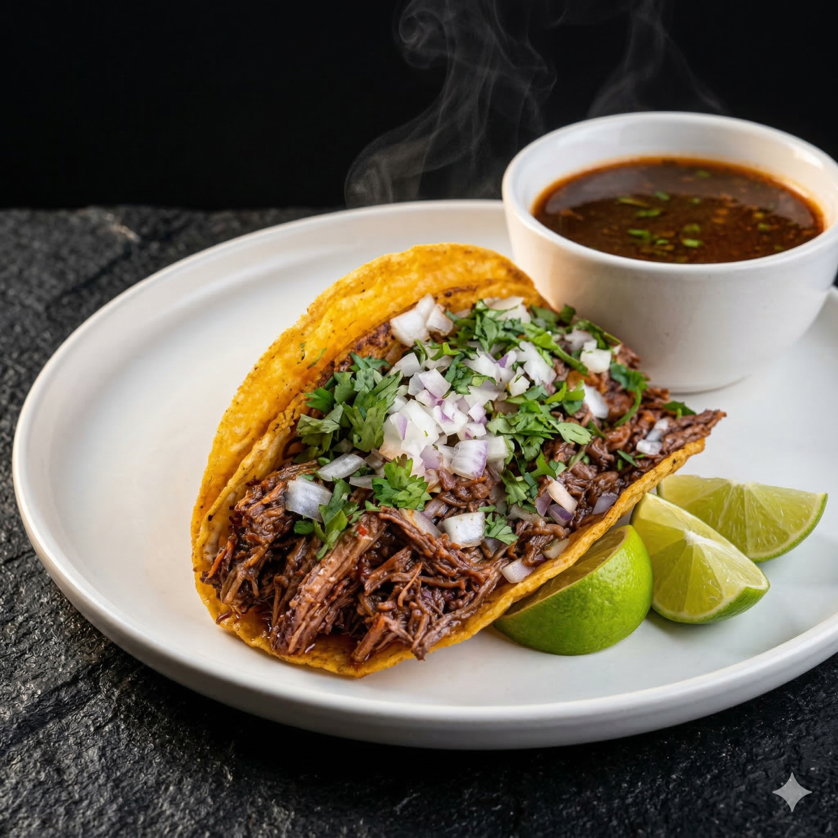 1 pza Taco blando de birria tortilla de maíz frita en la grasita de la casa hasta quedar extra crujiente, rellena de birria de res suave y jugosa.