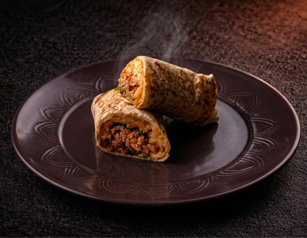 1 pza Burrito tortilla de harina rellena de pastor, bien envuelto y listo para el gran bocado.