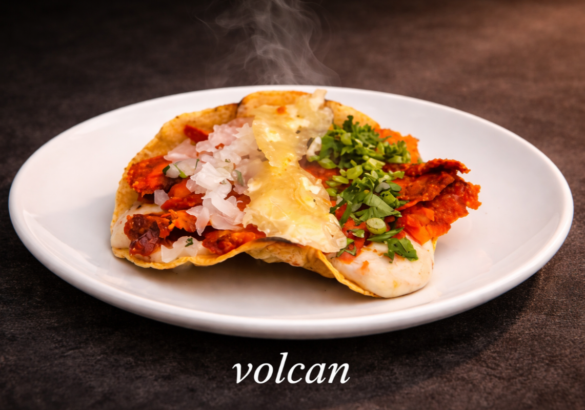 1 pza Volcán con queso tortilla de maíz tostada y crujiente cubierta de queso fundido con carne al pastor.