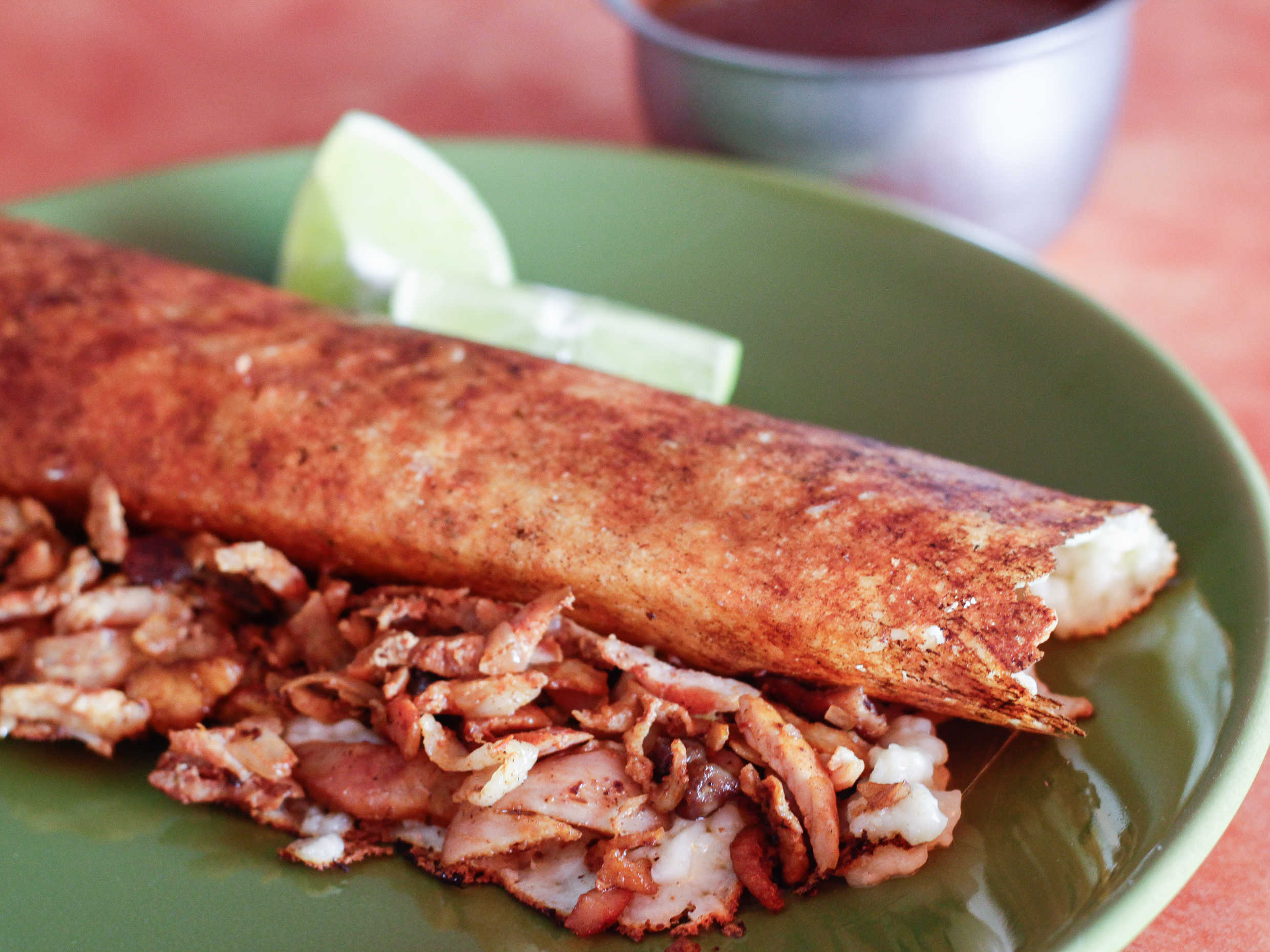 Pastor, envuelto en un chicharrón de queso en tortilla de harina.
