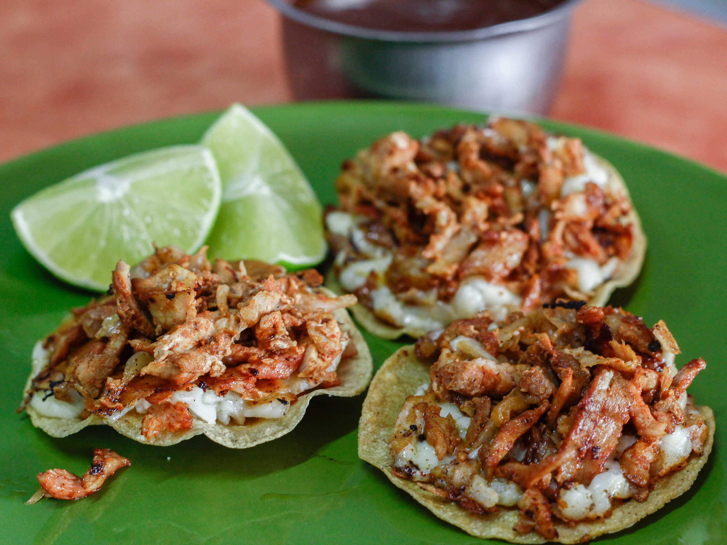 Orden de 3 piezas. Tostada de maíz, queso derretido y proteína.