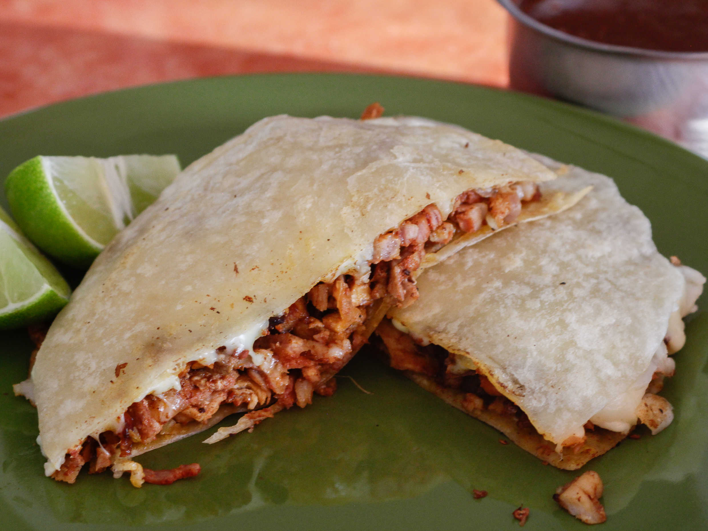 Dos tortillas de harina con queso y campechana (suadero con longaniza).