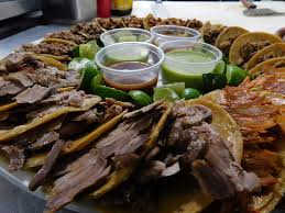 Charola de 450 grs. Bistec, longaniza, tocino, jamón, cebolla, chile morrón y queso. Tortillas, limones y salsas.