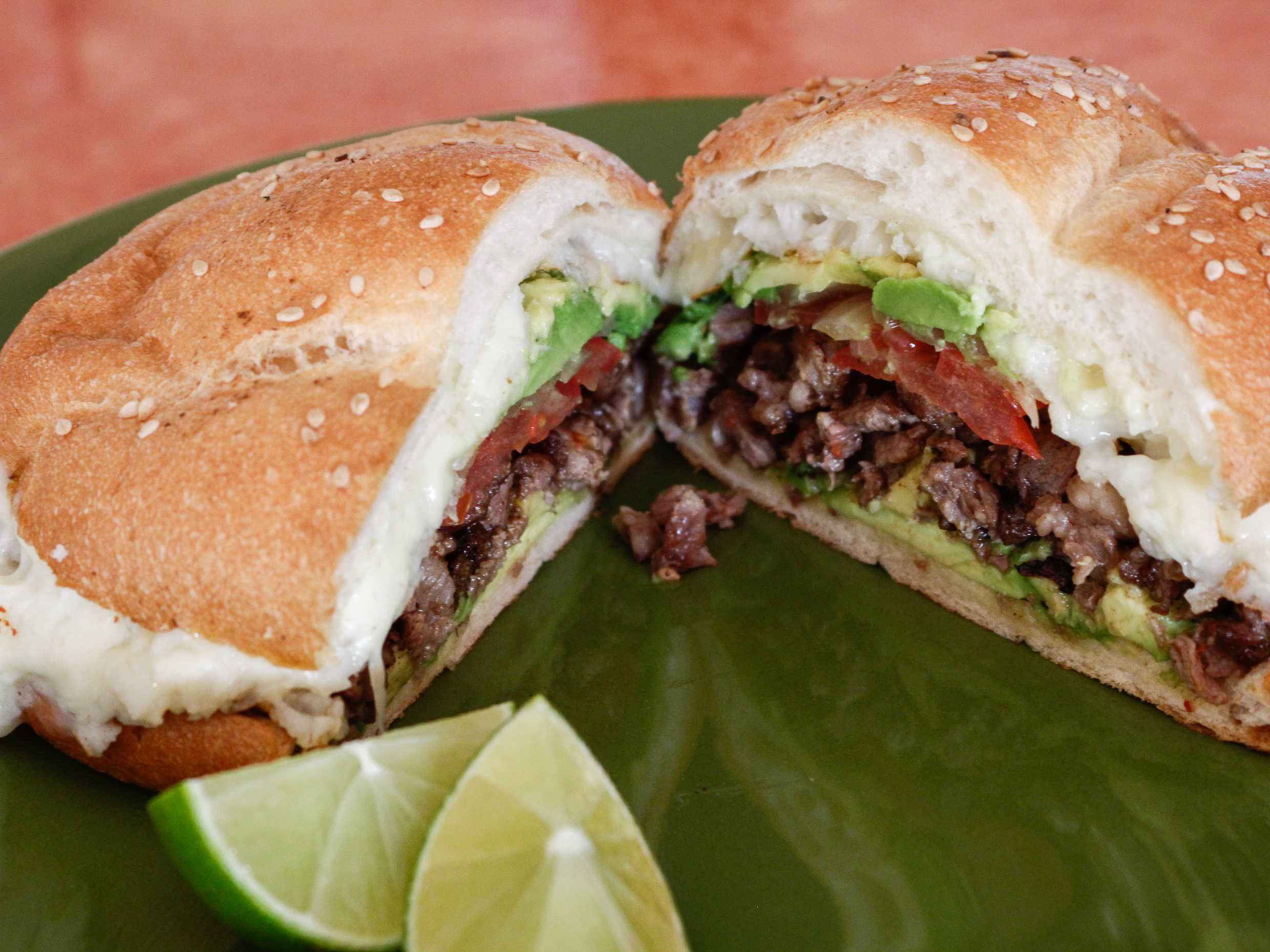 Telera con ajonjolí, bistec, cebolla, cilantro, jitomate, aguacate y queso derretido.