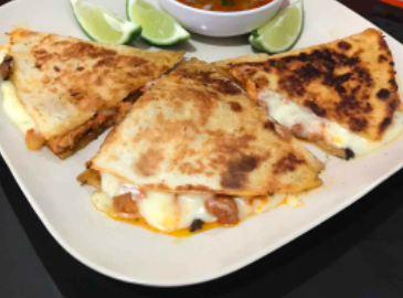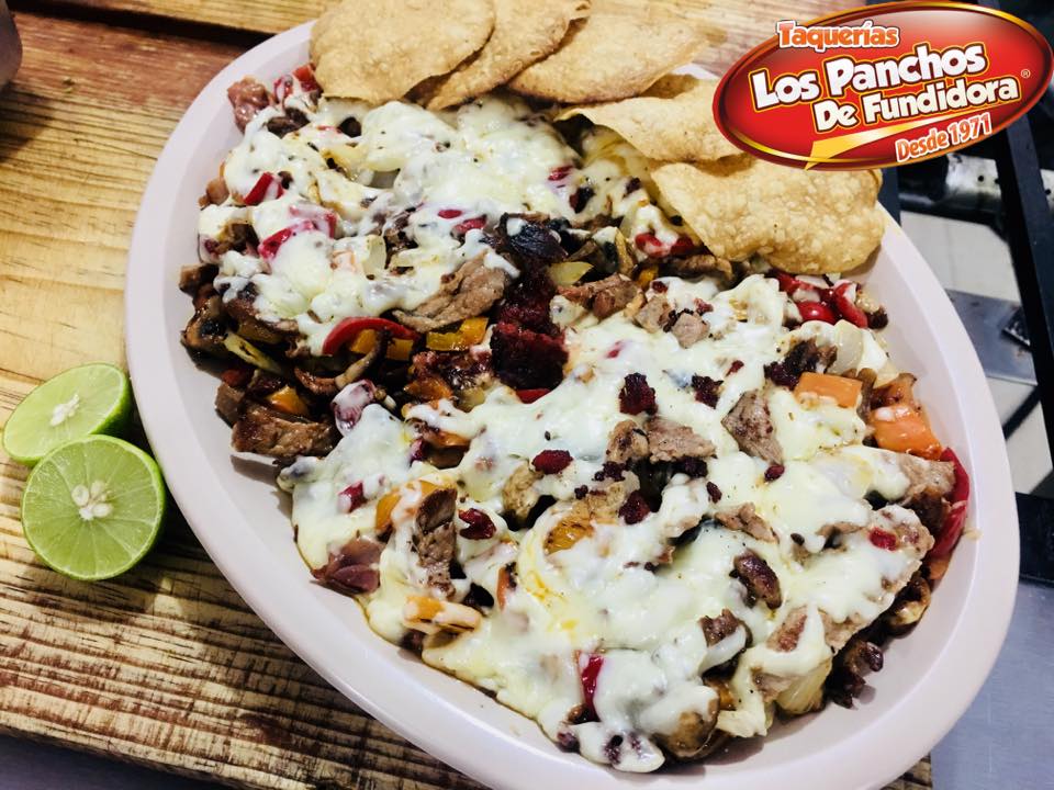 Mega Tortilla de harina con Carne de Suadero y Chorizo en una base de frijoles refritos , cebollita asada ,cilantro ,aguacate, y queso Gouda