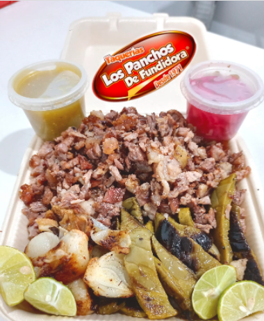 (Charola 450 grs) bistec,longaniza,tocino,jamón,Cebolla,Pimiento morrón,queso. Incluye tortillas, limón y salsas