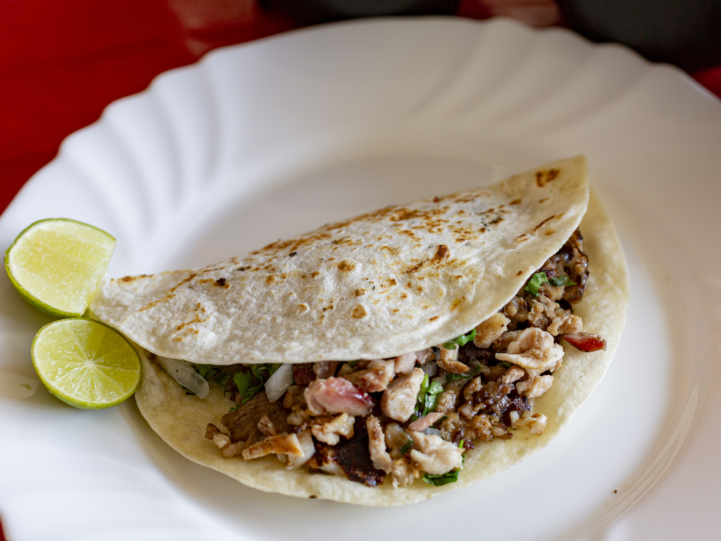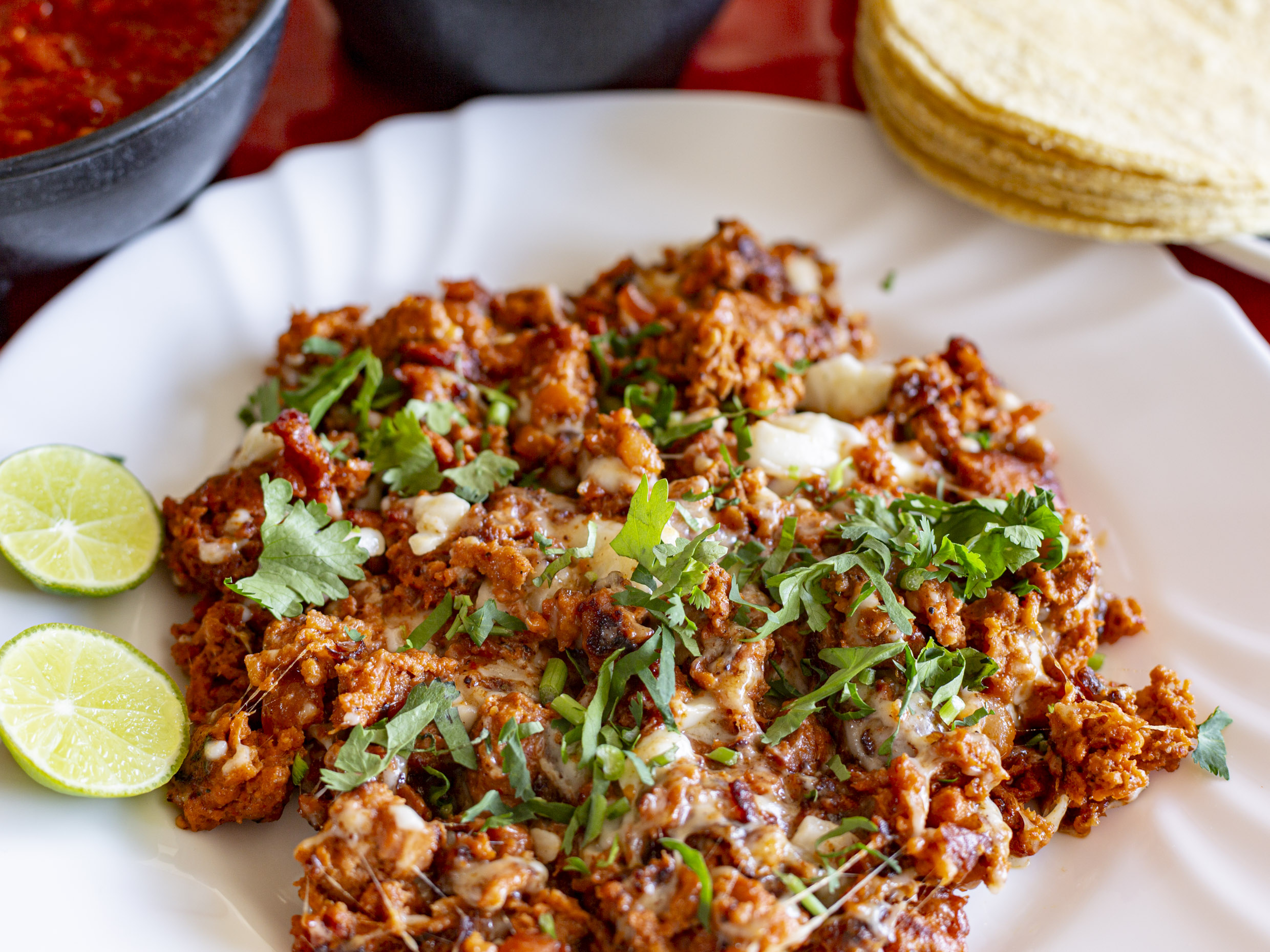 Carne al pastor, Cebolla, Chile morrón, Queso asadero, Tocino acompañado de tortillas de maíz, Salsa, Limones
