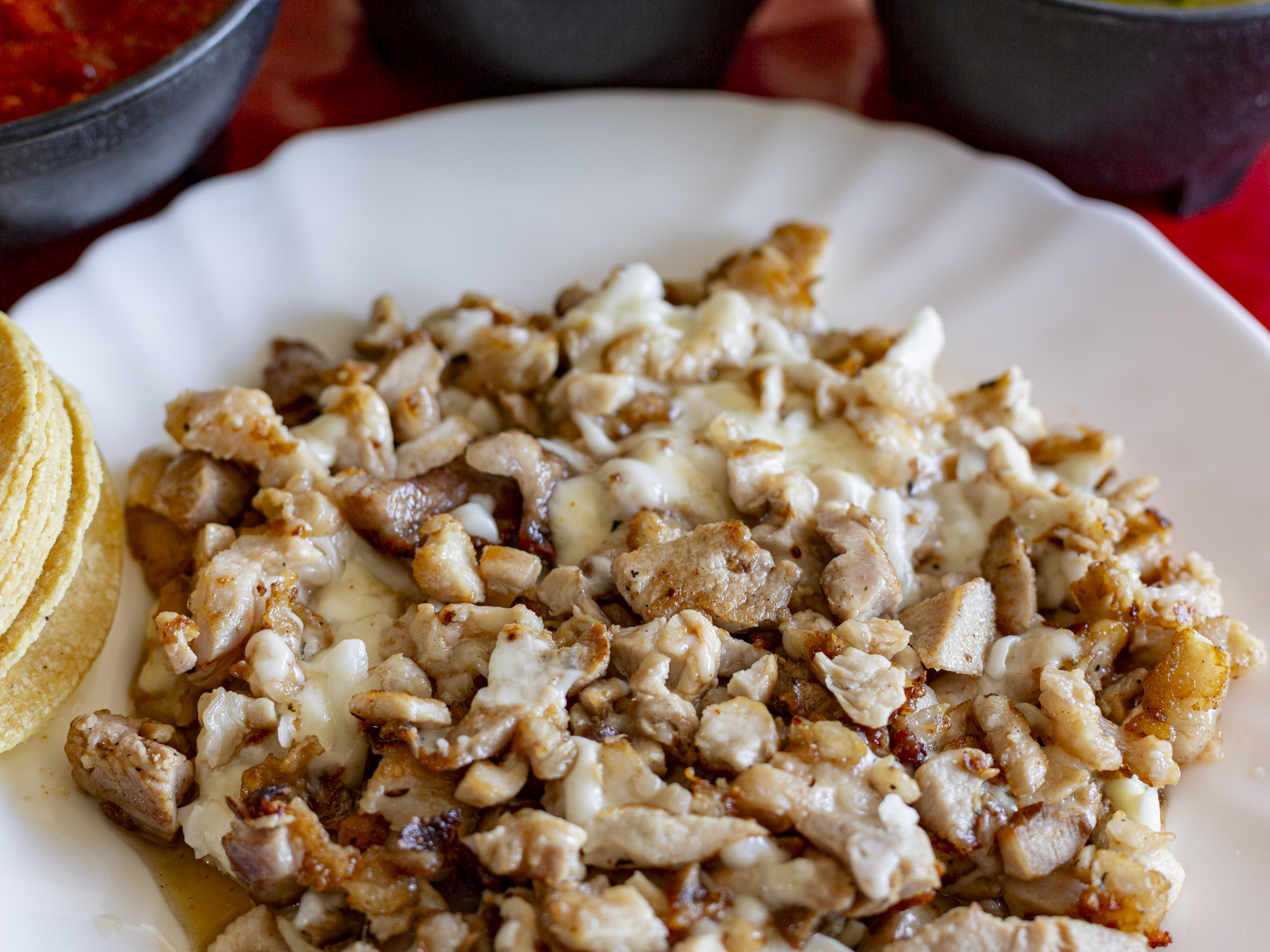 Cebolla, Chile morrón, Queso asadero, Tocino acompañado de tortillas de maíz, Salsa, Limones