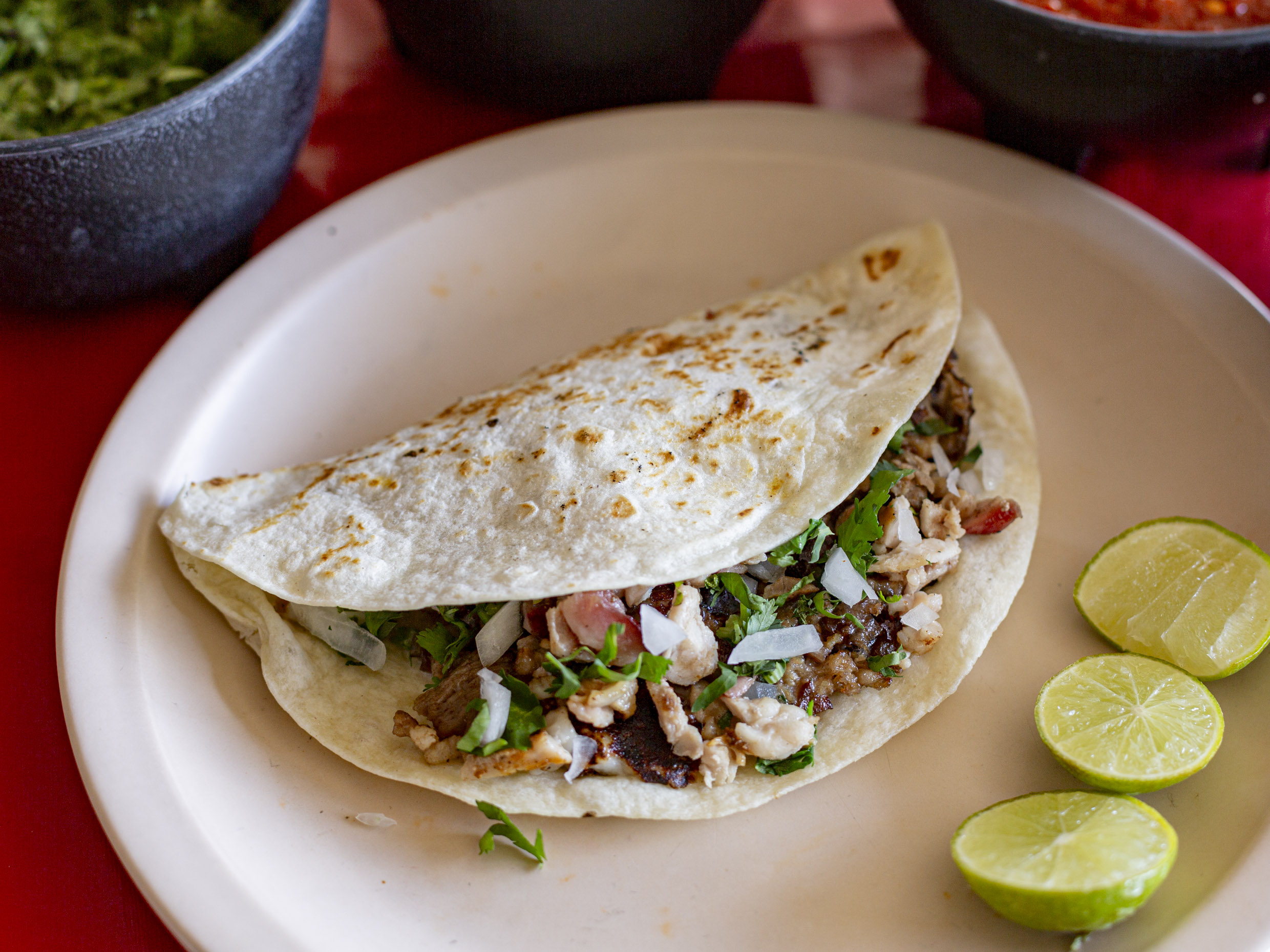 Tortillas, Salsas, limones, cebolla y cilantro