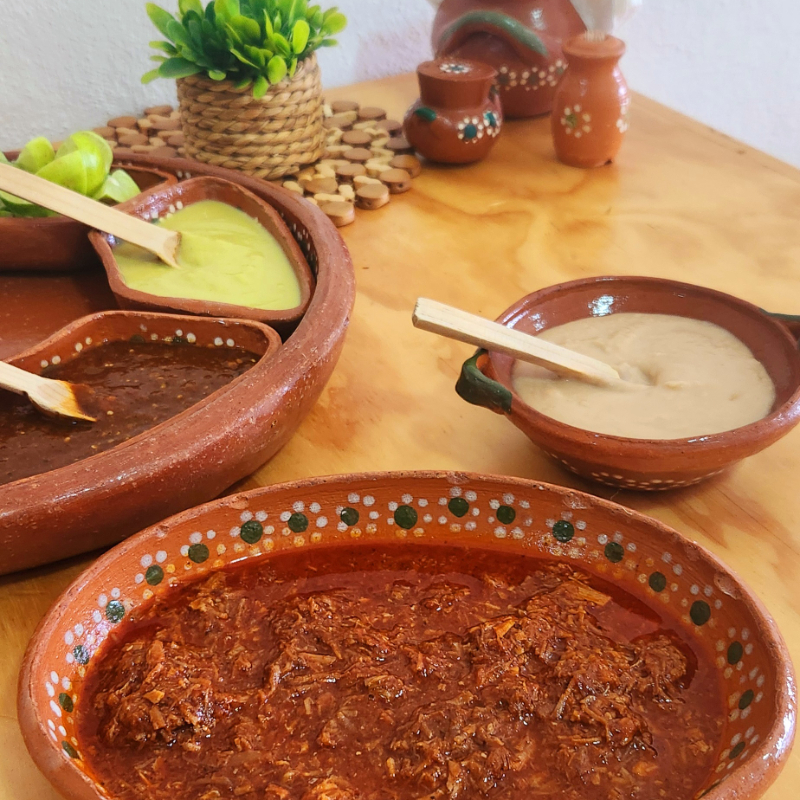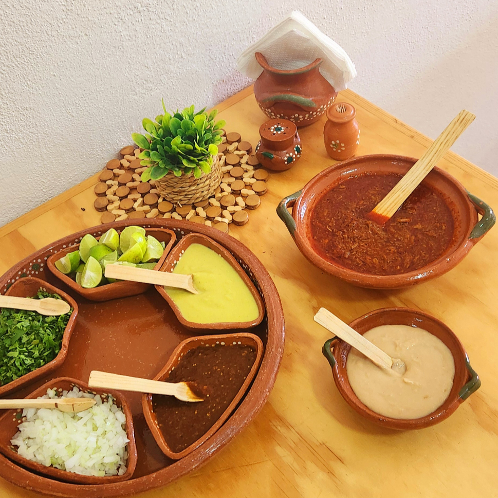 Barbacoa, consomé, frijoles refritos, tortillas, salsa, limón, cebolla y cilantro.