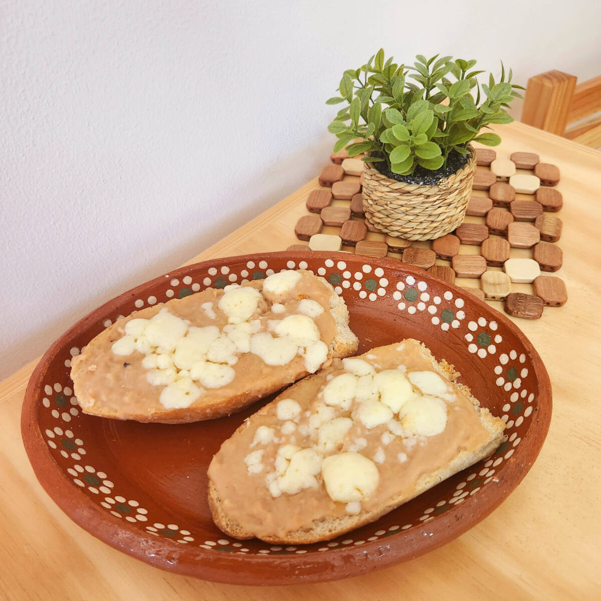 Bolillo fleima de Guadalajara con frijoles y queso adobera.