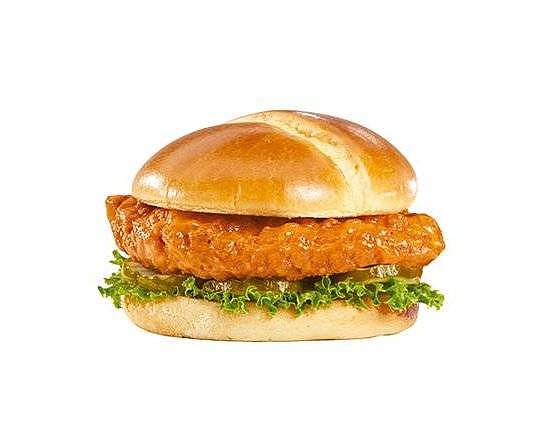 Hamburguesa con pechuga de pollo frita, dorada, salsa buffalo, lechuga y pepinillos en pan partido por encima.