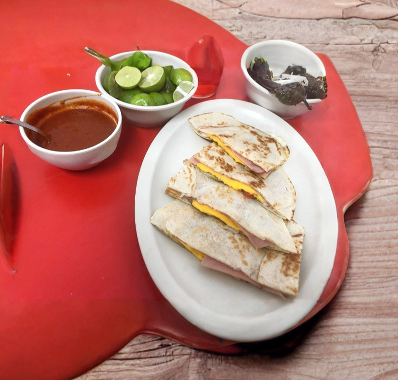 Queso oaxaca, queso amarillo, jamón (cebolla, jitomate, aguacate, salsa)