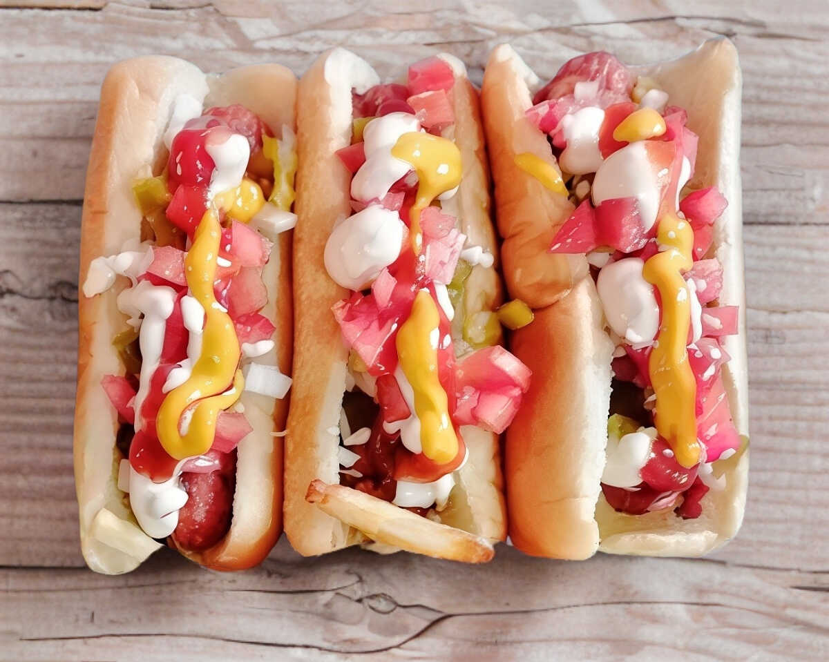 2 hochos con la salchicha enrollada por tocino previamente fritos, el pan se calienta al vapor e incluye verduras picadas y aderezos en bolsas selladas
