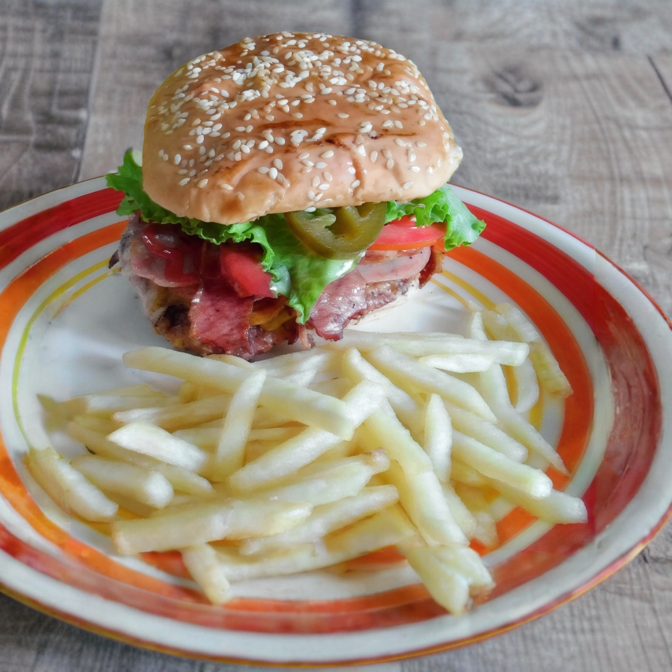 Carne, Queso Amarillo, Aguacate, Jitomate, Cebolla, Lechuga, Chiles en Vinagre, Catsup, Mayonesa, Mostaza y Papas Francesas