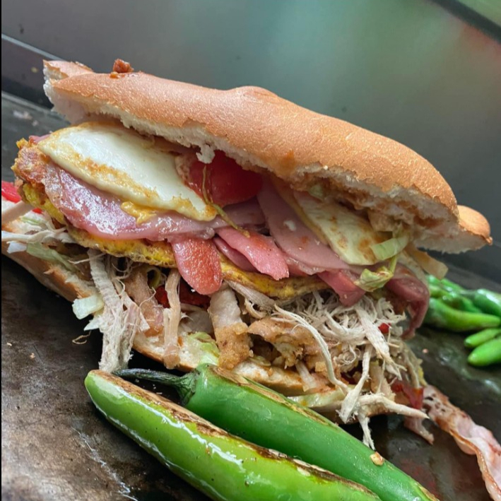 Jamón con frijoles, aguacate, lechuga, jitomate, cebolla, crema, chiles y limones.