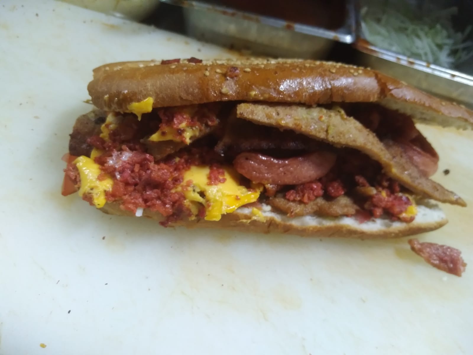 Milanesa, chorizo, salchicha y queso Oaxaca.