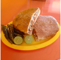Torta de pan grande (milanesa, salchicha, jamón, chorizo y queso aguacate, jitomate, cebolla, chipotle).