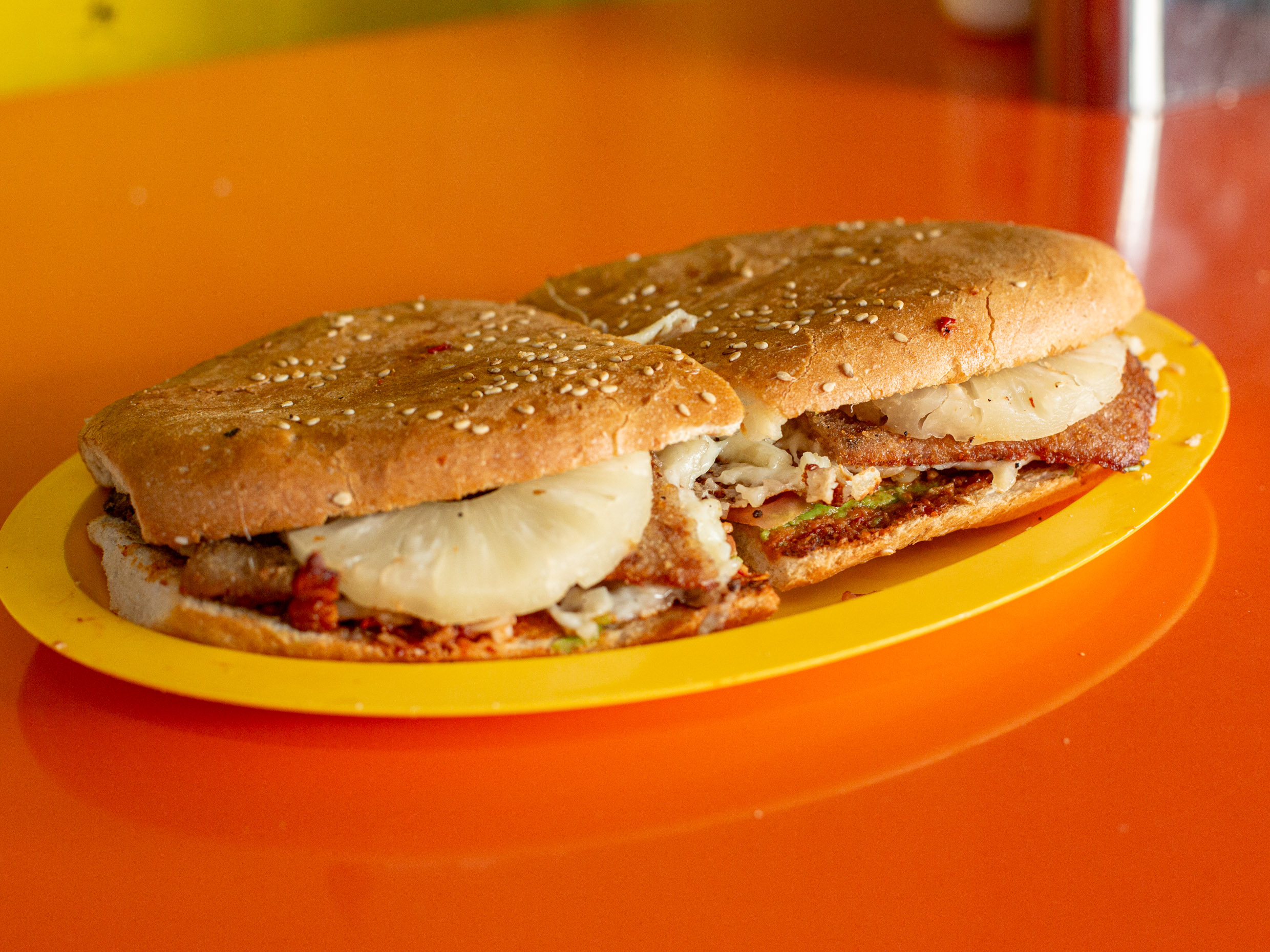 Torta de pan grande (Milanesa, piña y queso oaxaca. Aguacate jitomate. Ebolla chipotle )