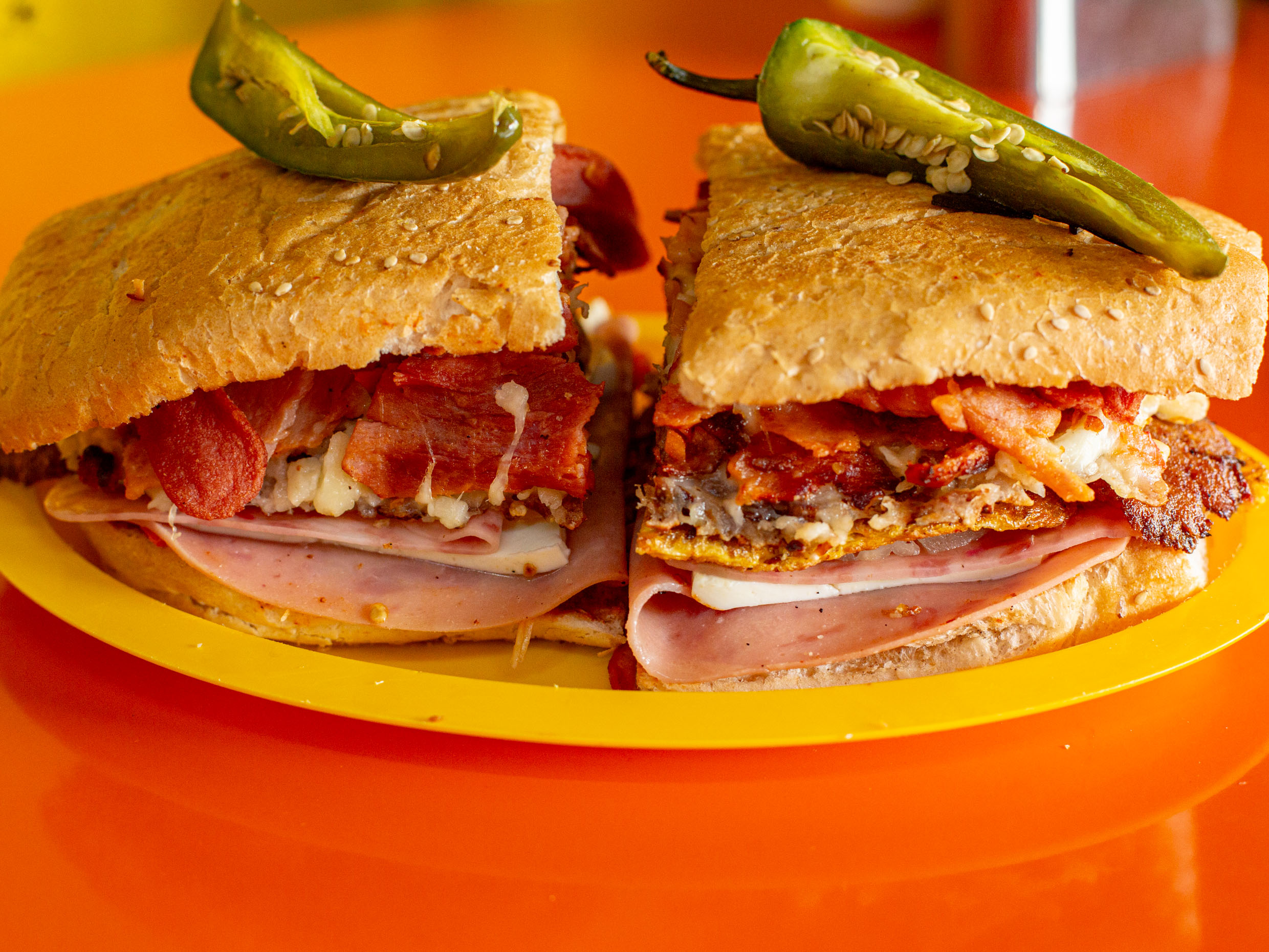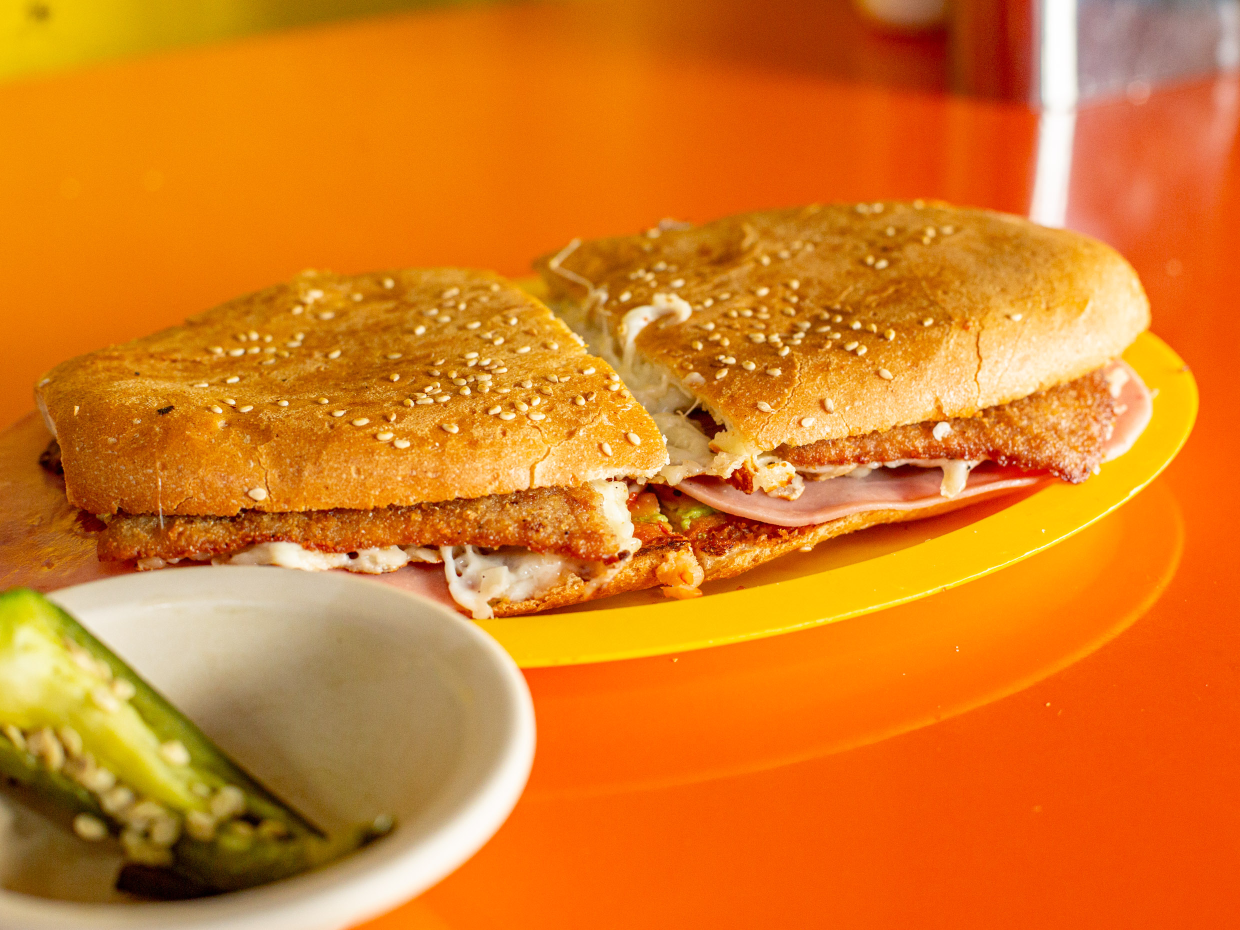 pan telera grande (Milanesa, salchicha, pierna, jamón, chorizo, huevo, queso amarillo, queso de puerco, queso panela, queso oaxaca y piña aguacate, jitomate, cebolla, chipotle.