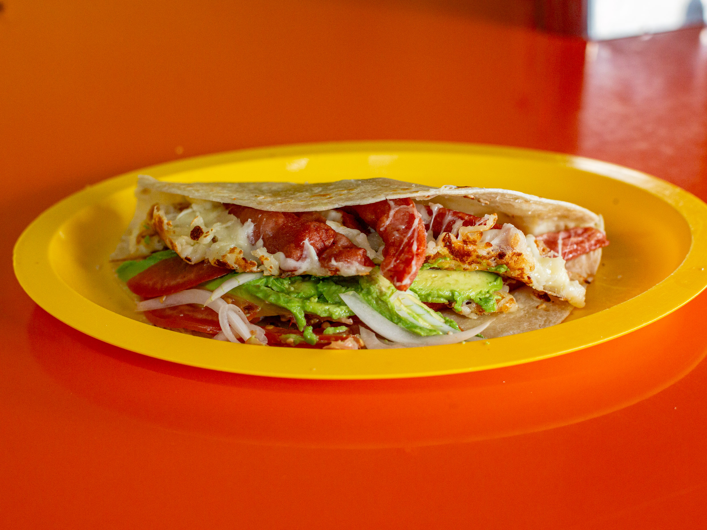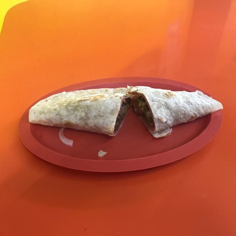 Tortilla de Harina, salchicha, aguacate, jitomate, cebolla, chipotle).
