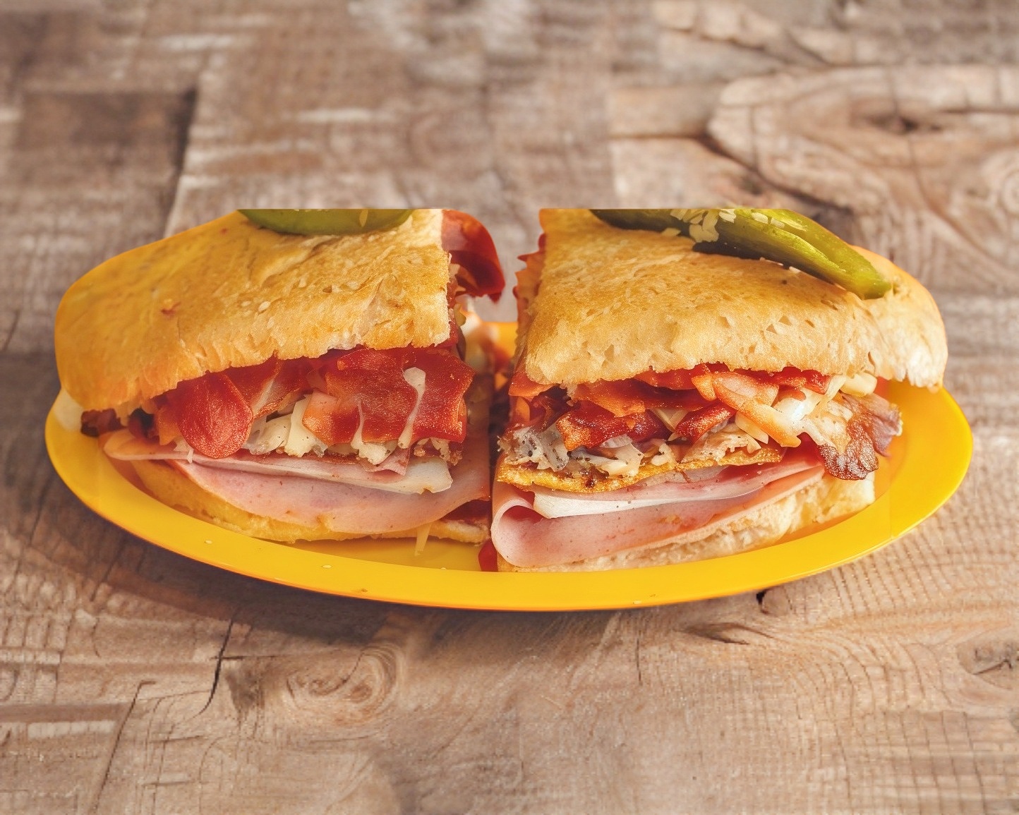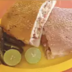 Pan telera grande (milanesa, salchicha, pierna, jamón, chorizo, huevo, queso amarillo, queso de puerco, queso panela, queso oaxaca, piña, aguacate, jitomate, cebolla, chipotle).