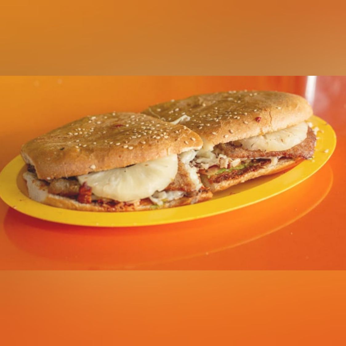 Torta de pan grande (milanesa, piña, queso oaxaca, aguacate, jitomate, cebolla chipotle).
