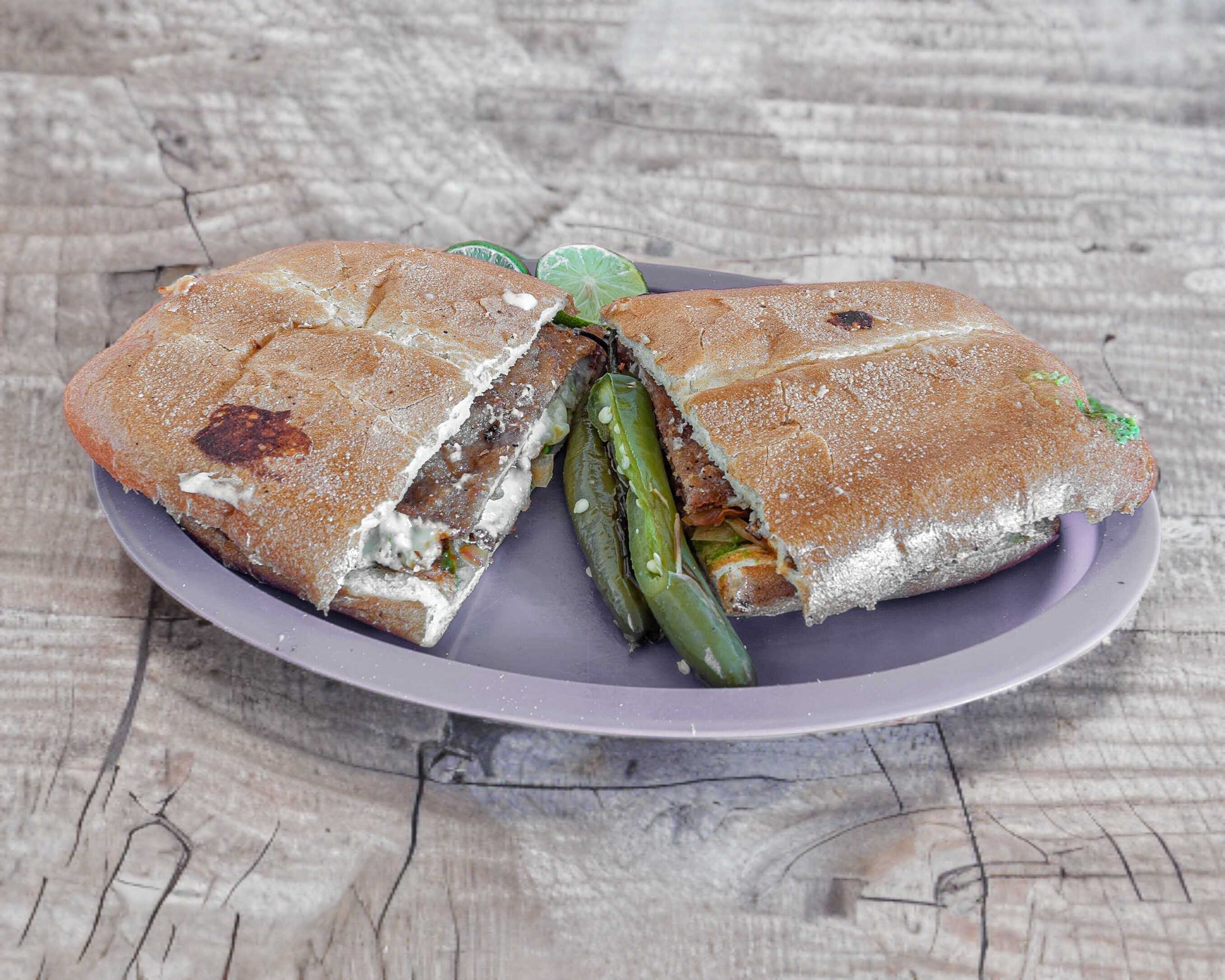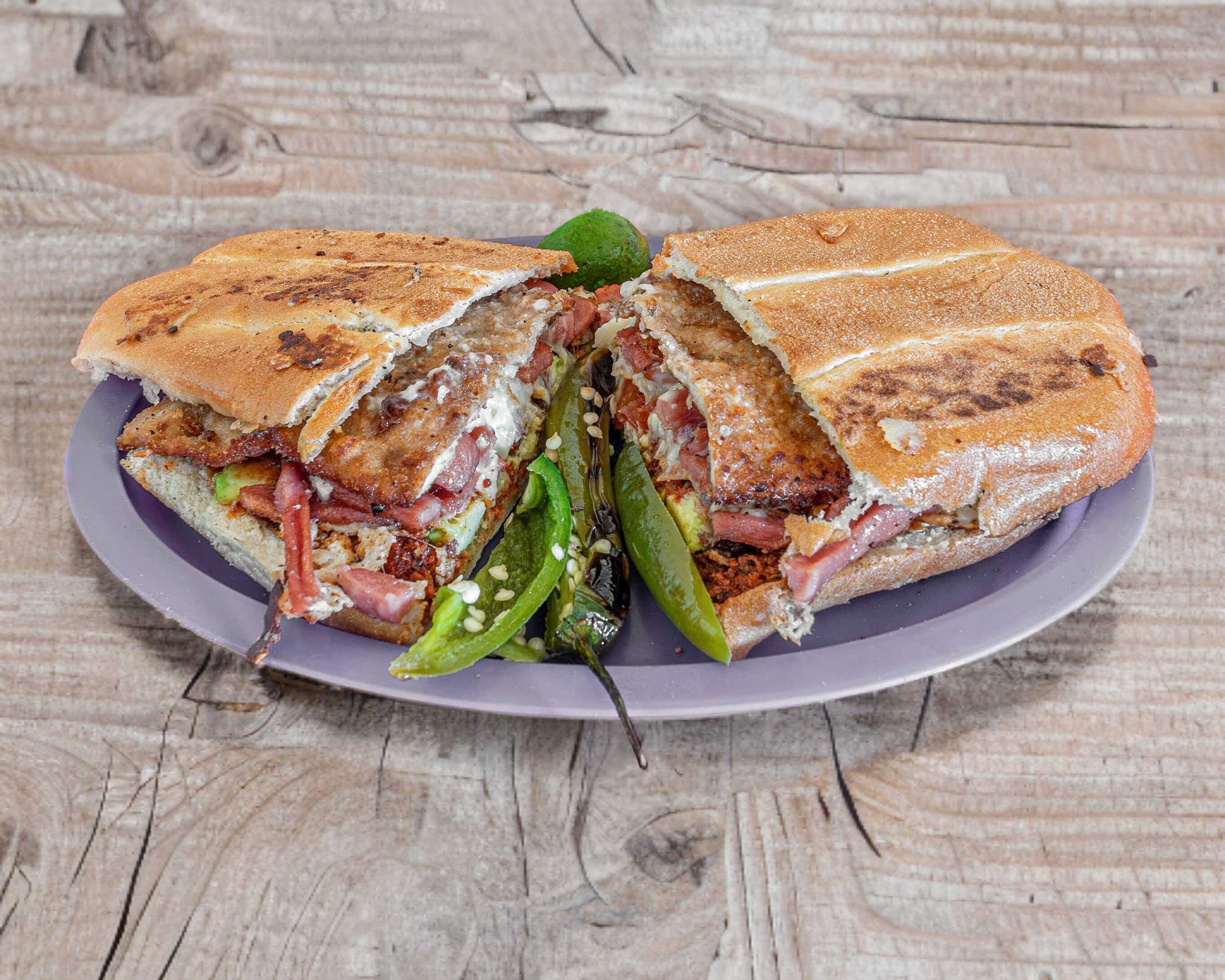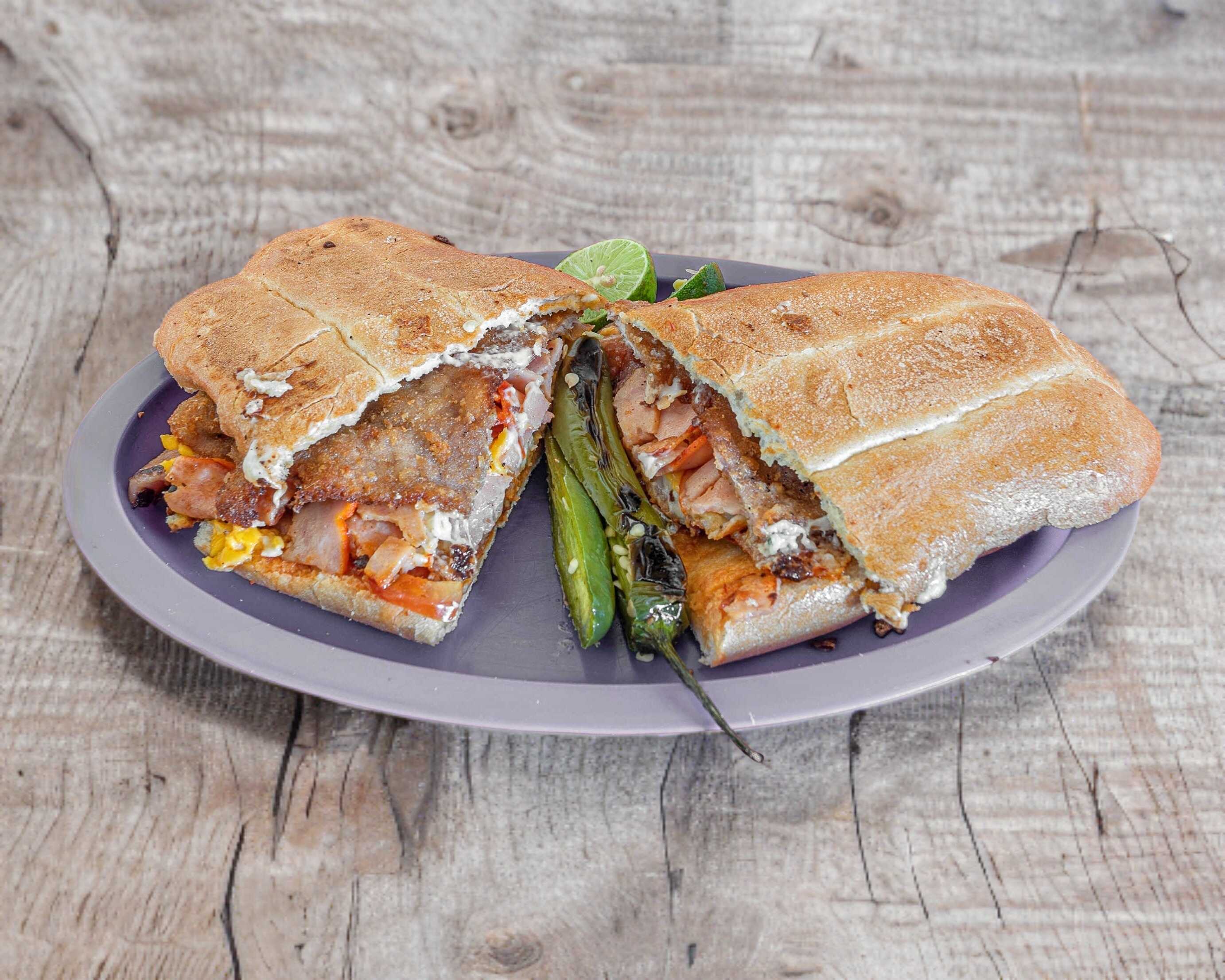 Pierna, milanesa, queso oaxaca, crema mantequilla, jitomate, cebolla, aguacate y salsa chipotle.