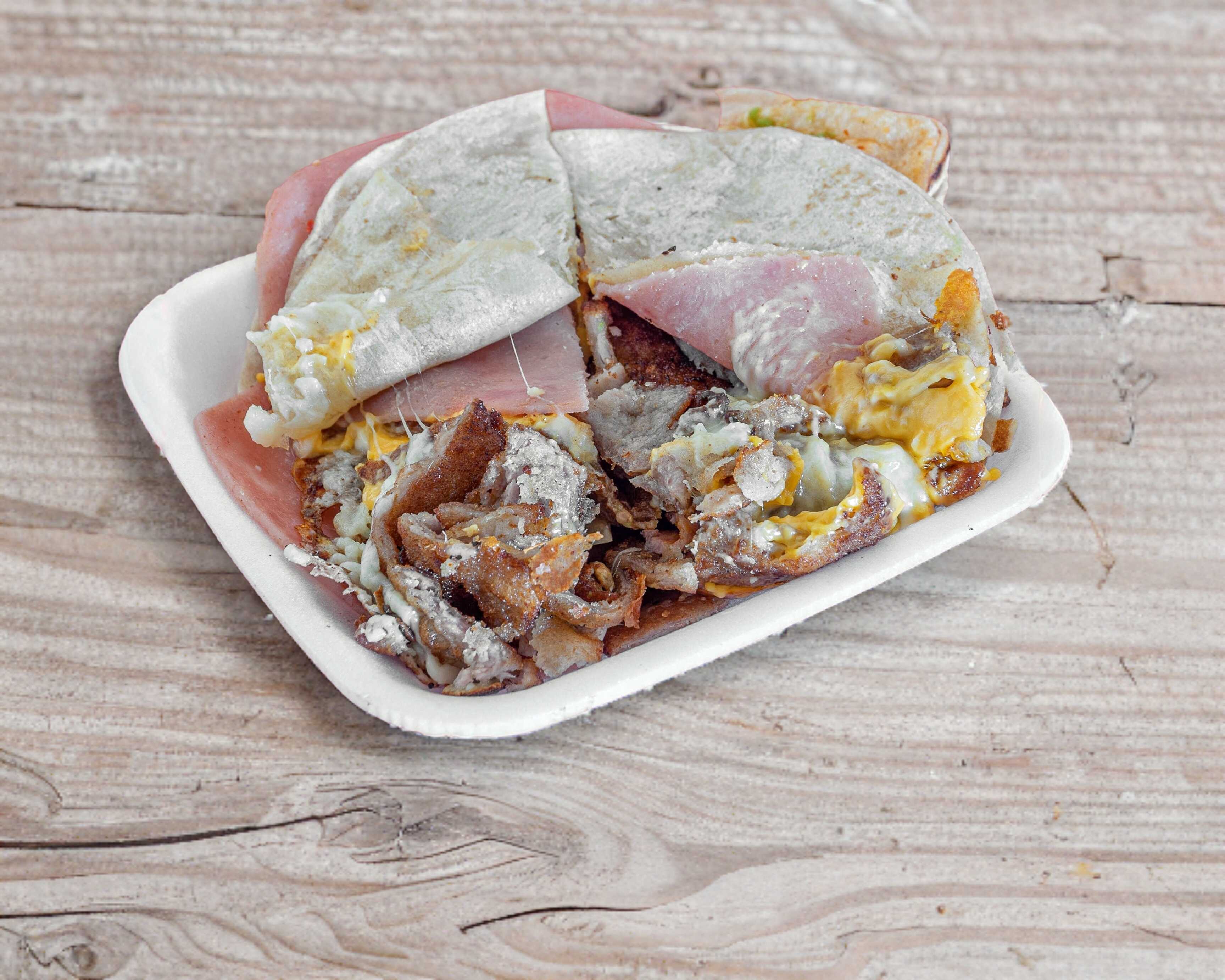 Queso oaxaca y un ingrediente extra (milanesa, pierna, salchicha, jamón, chorizo, huevo, queso amarillo, queso panela, queso de puerco) jitomate, cebolla, aguacate y salsa chipotle.