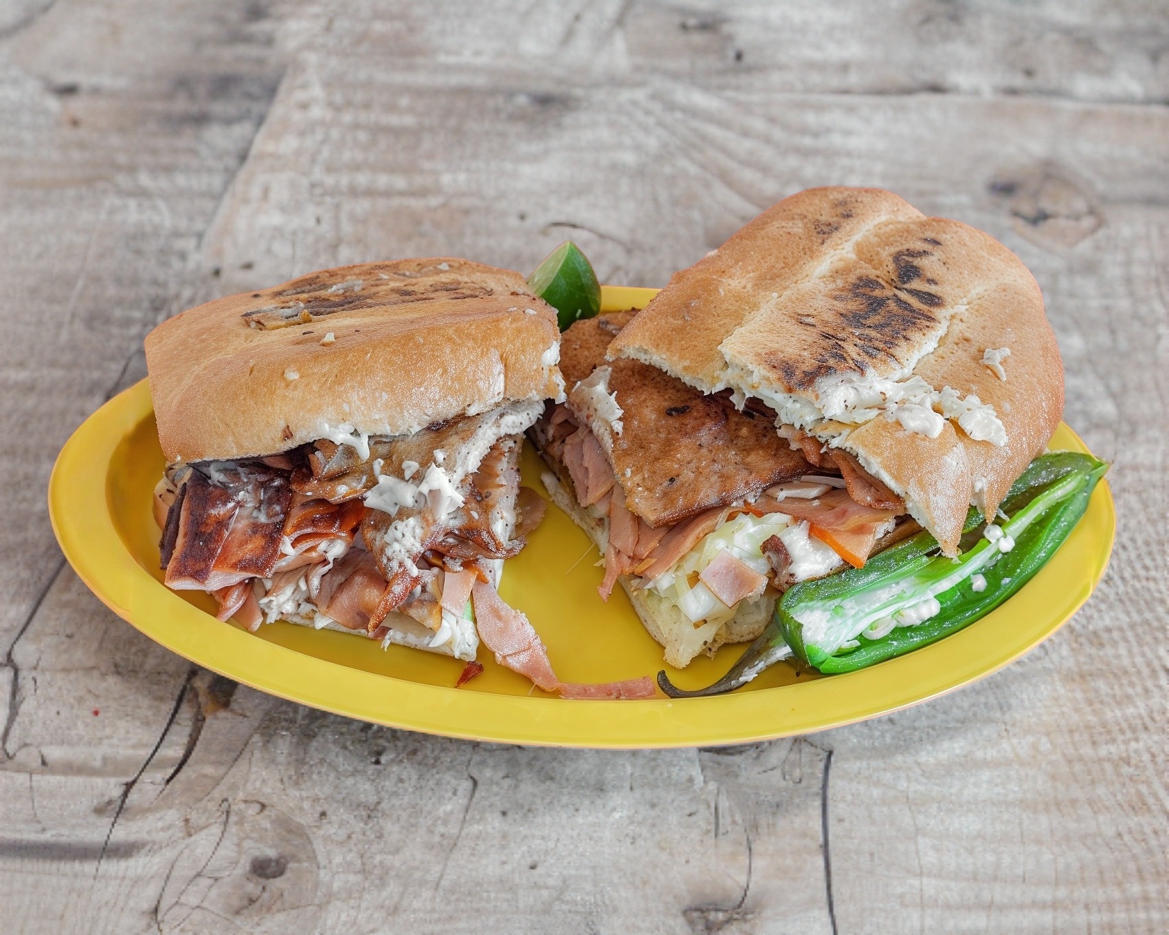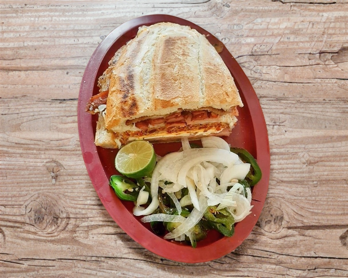 Jamón, queso de puerco, queso oaxaca, queso amarillo, crema, mantequilla, jitomate, cebolla, aguacate y salsa chipotle.