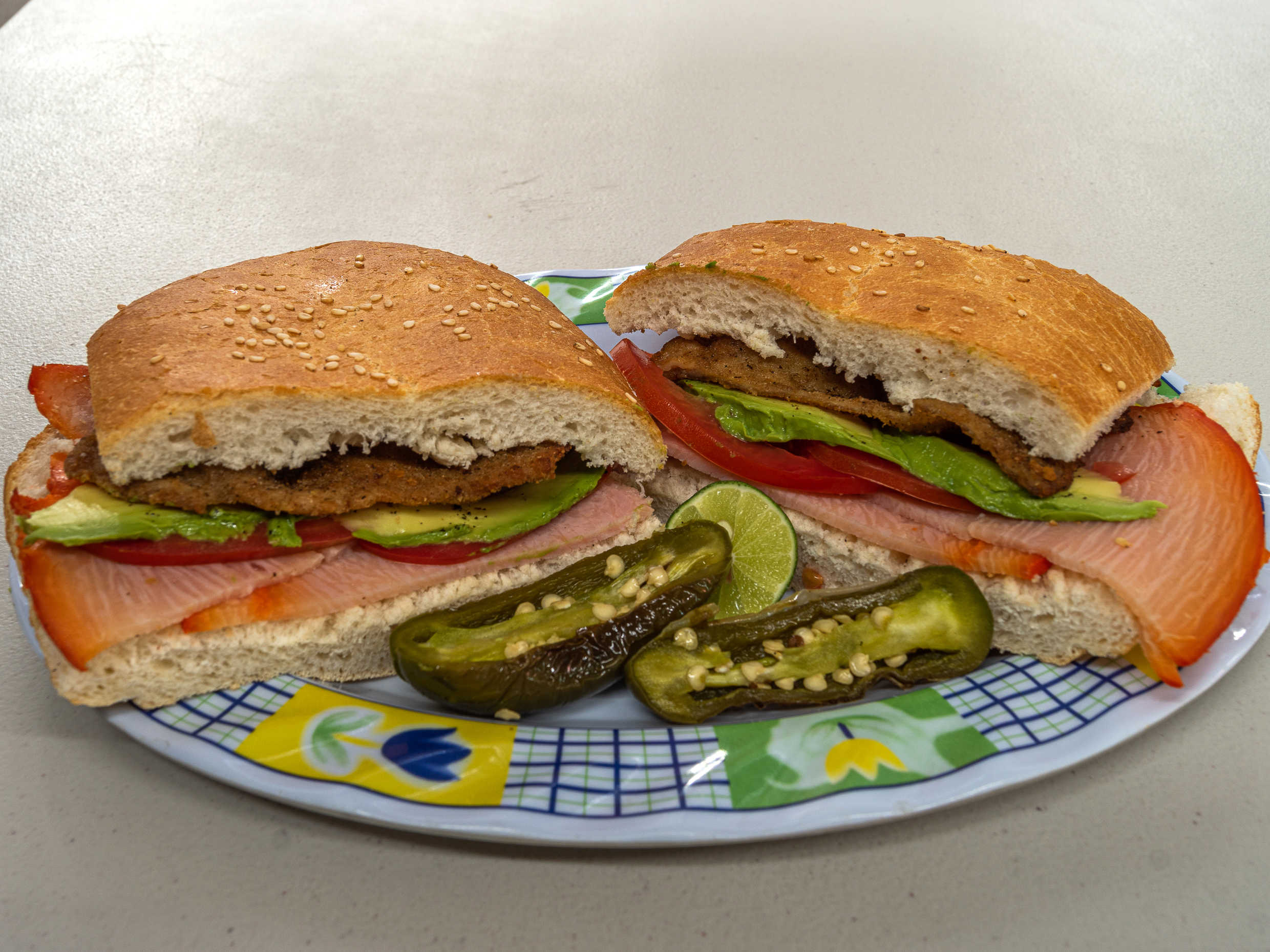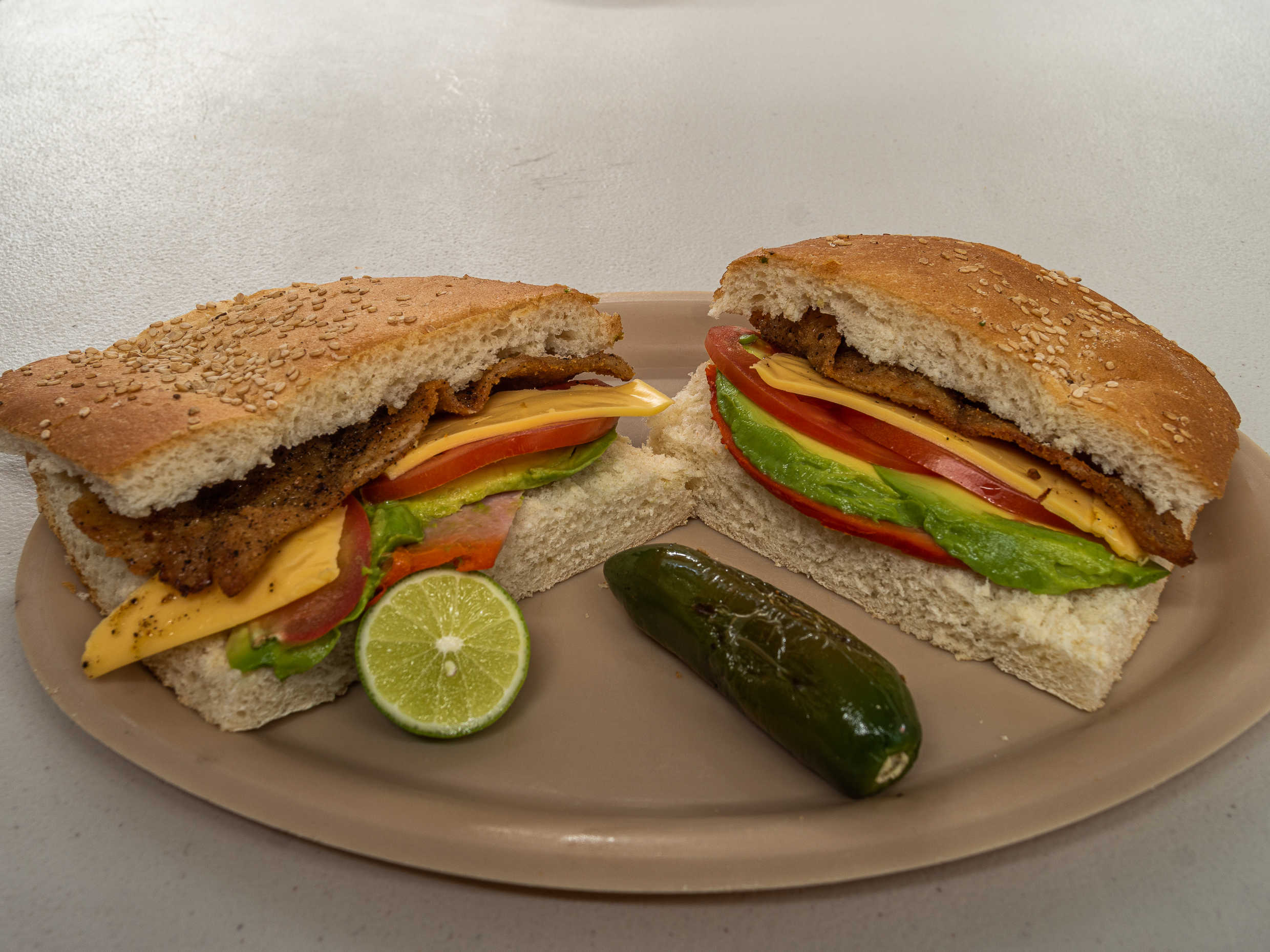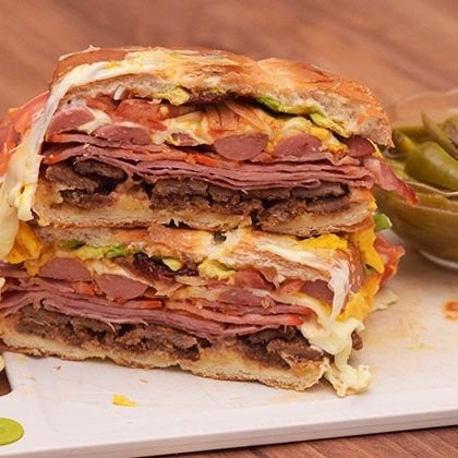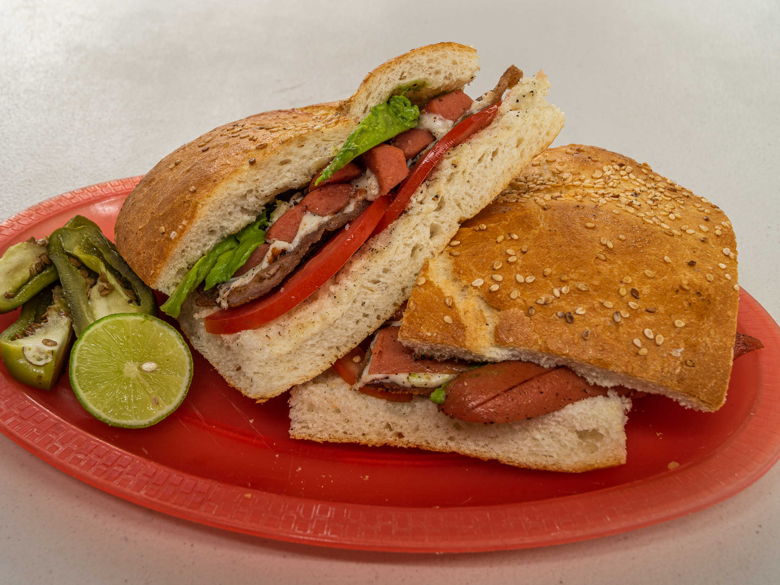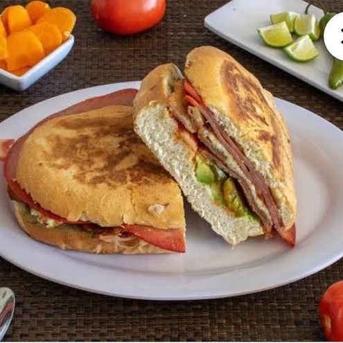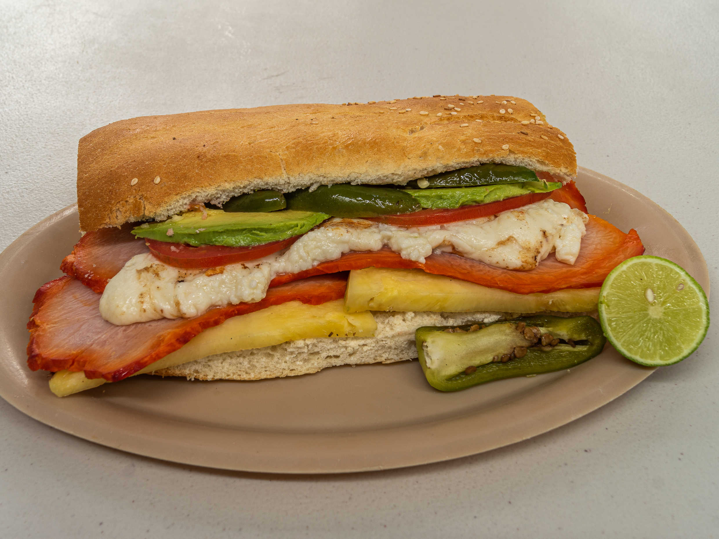 Jamón, amarillo, oaxaca, jitomate, cebolla, aguacate y salsa de chipotle.