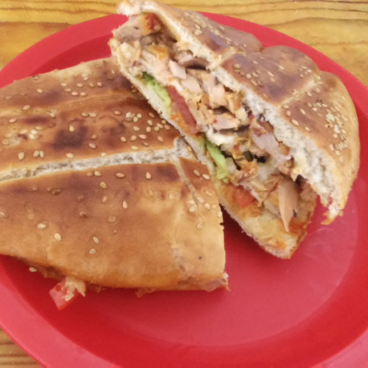 Pan con crema, mantequilla, cebolla, jitomate, aguacate, salsa o chiles y milanesa de pollo.