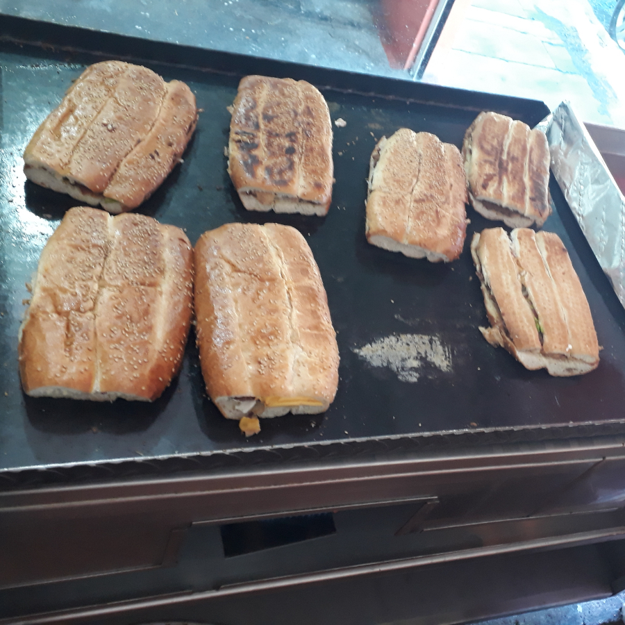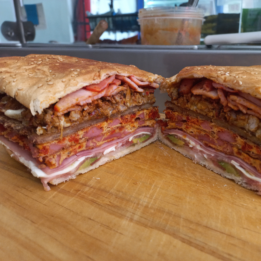 pan con crema, mantequilla, cebolla, jitomate, aguacate, salsa o chiles, mlanesa, pastor, pierna, huevo, salchicha, chorizo, jamon, piña, queso de puerco, queso panela, queso amarillo y queso oaxaca.oaxaca