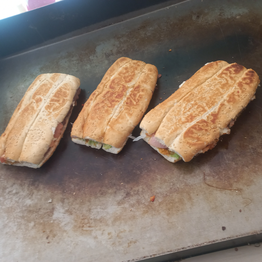 pan con crema, mantequilla, cebolla, jitomate, aguacate, salsa o chiles y salchicha de pavo.