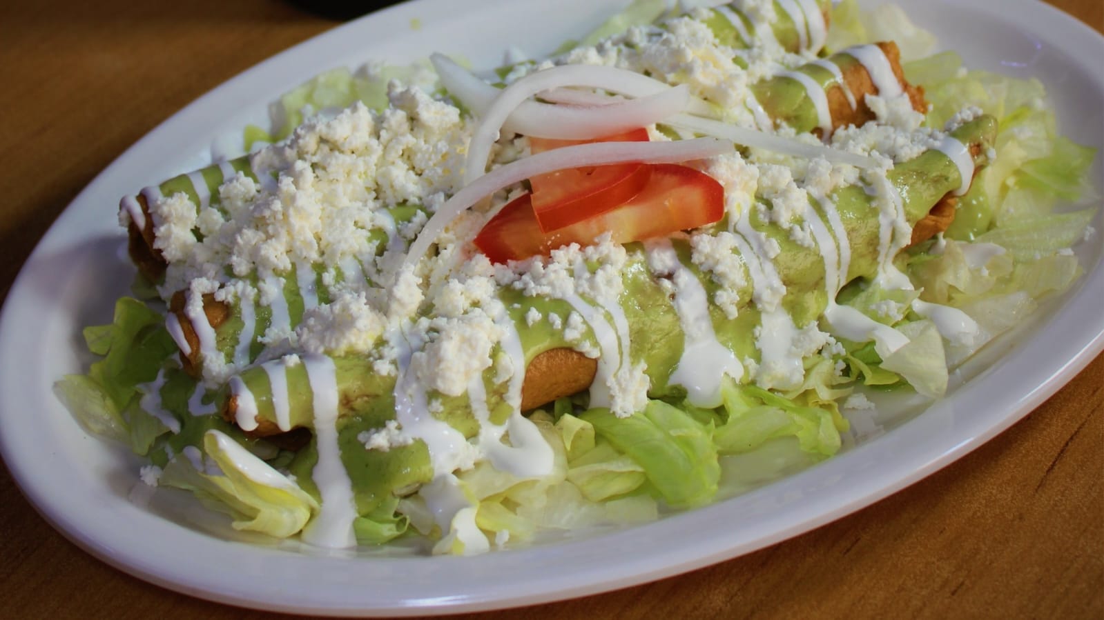 3 FLAUTAS DE POLLO SERVIDAS CON LECHUGA,GUACAMOLE,CREMA,QUESO FRESCO