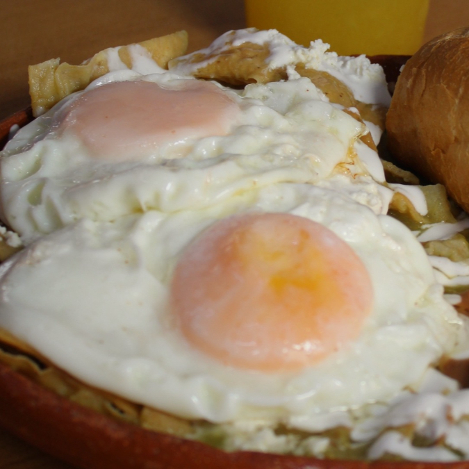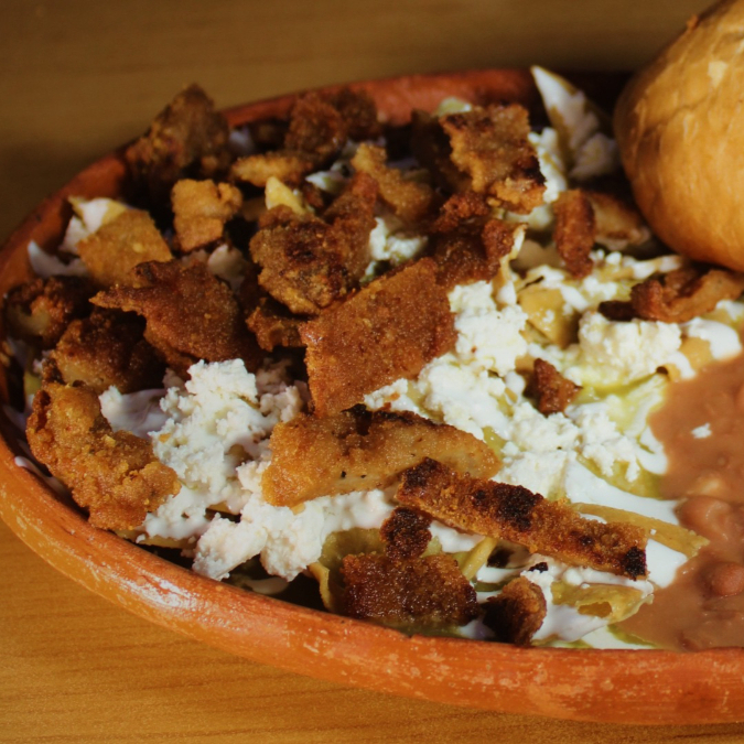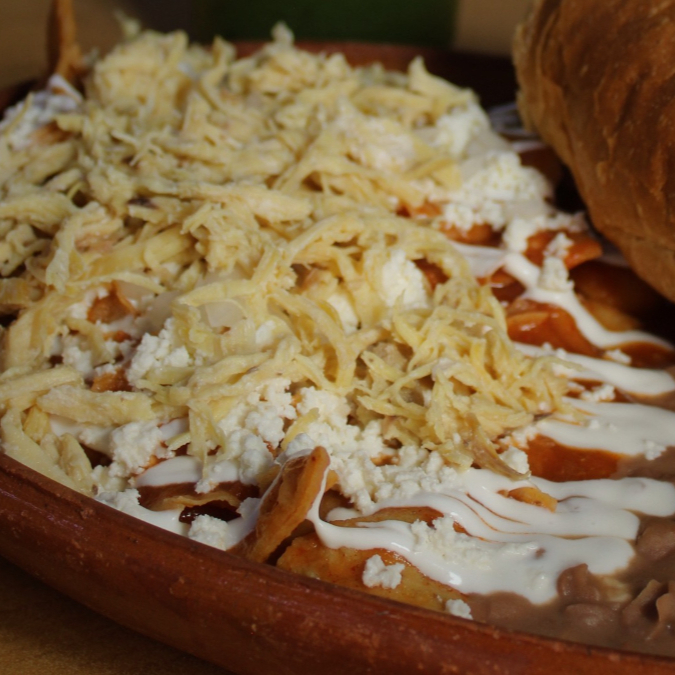 CHILAQULILES, (salsa,crema,queso fresco,cebolla pollo , frijoles y bolillo)