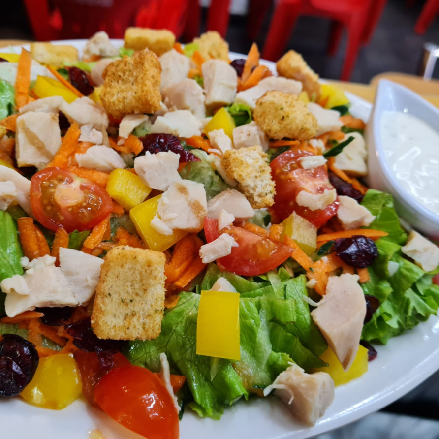 trozos de pechuga de pollo mix de lechuga italiana pepino,zanahoria,pimientos,arandanos,crutones, tomate cherry y aderezo ranch