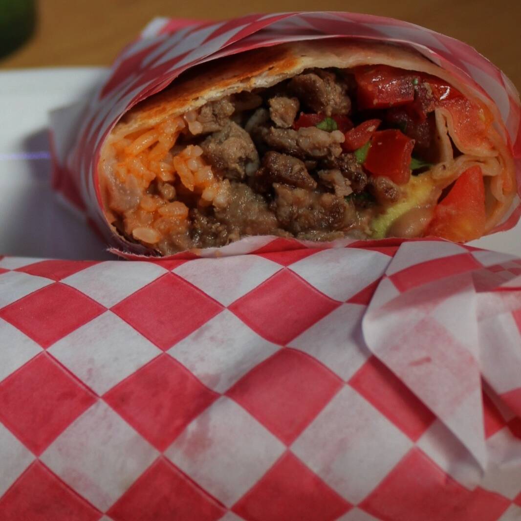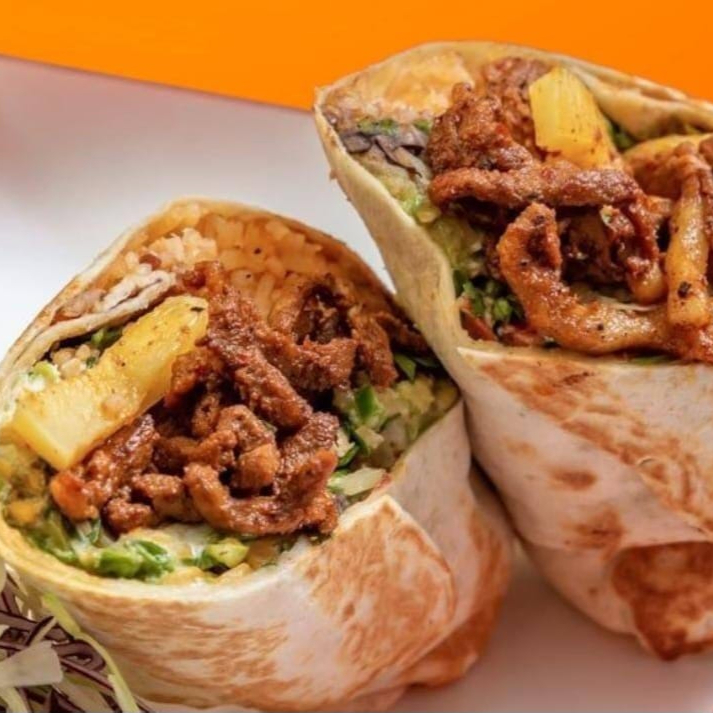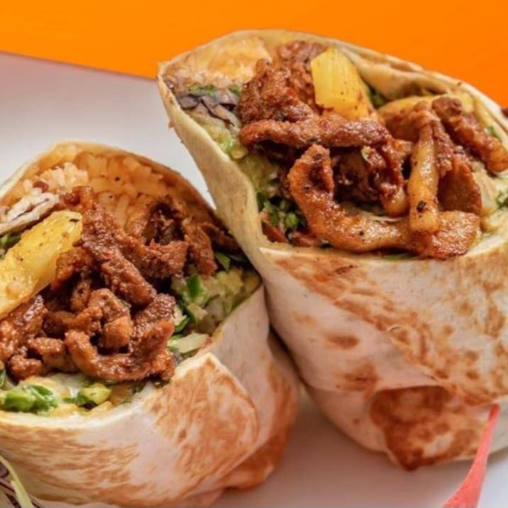 tortilla gigante de harina, frijoles,arroz,carne pastor, pico de gallo,aguacate