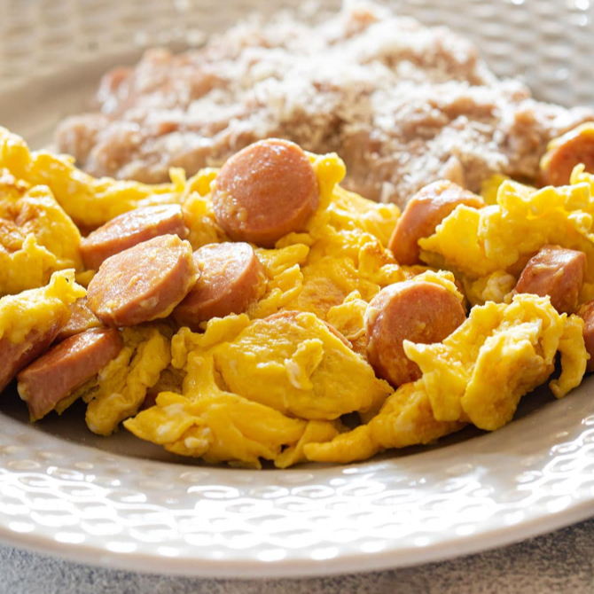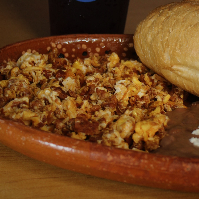 CHILAQUILES CO 2 PIEZAS DE (HUEVO REVUELTO) (salsa,queso fresco,crema,cebolla servidos con frijoles y bolillo)