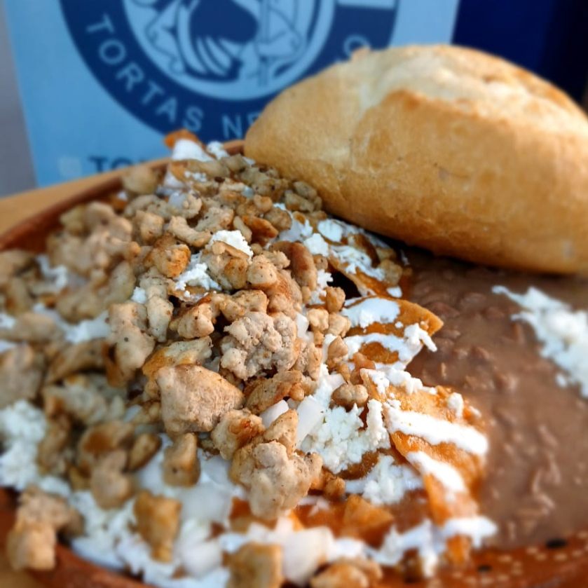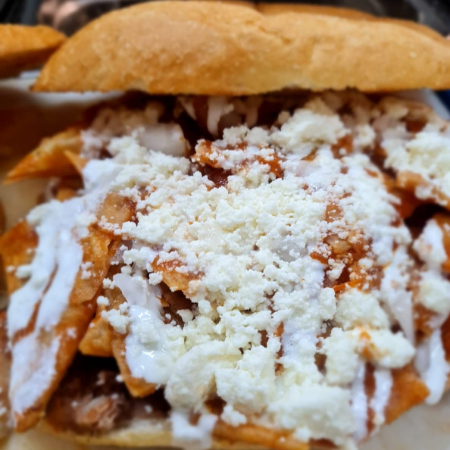 TORTA CON FRIJOLES, CHILAQUILES,CREMA ,QUESO FRESCO Y CEBOLLA