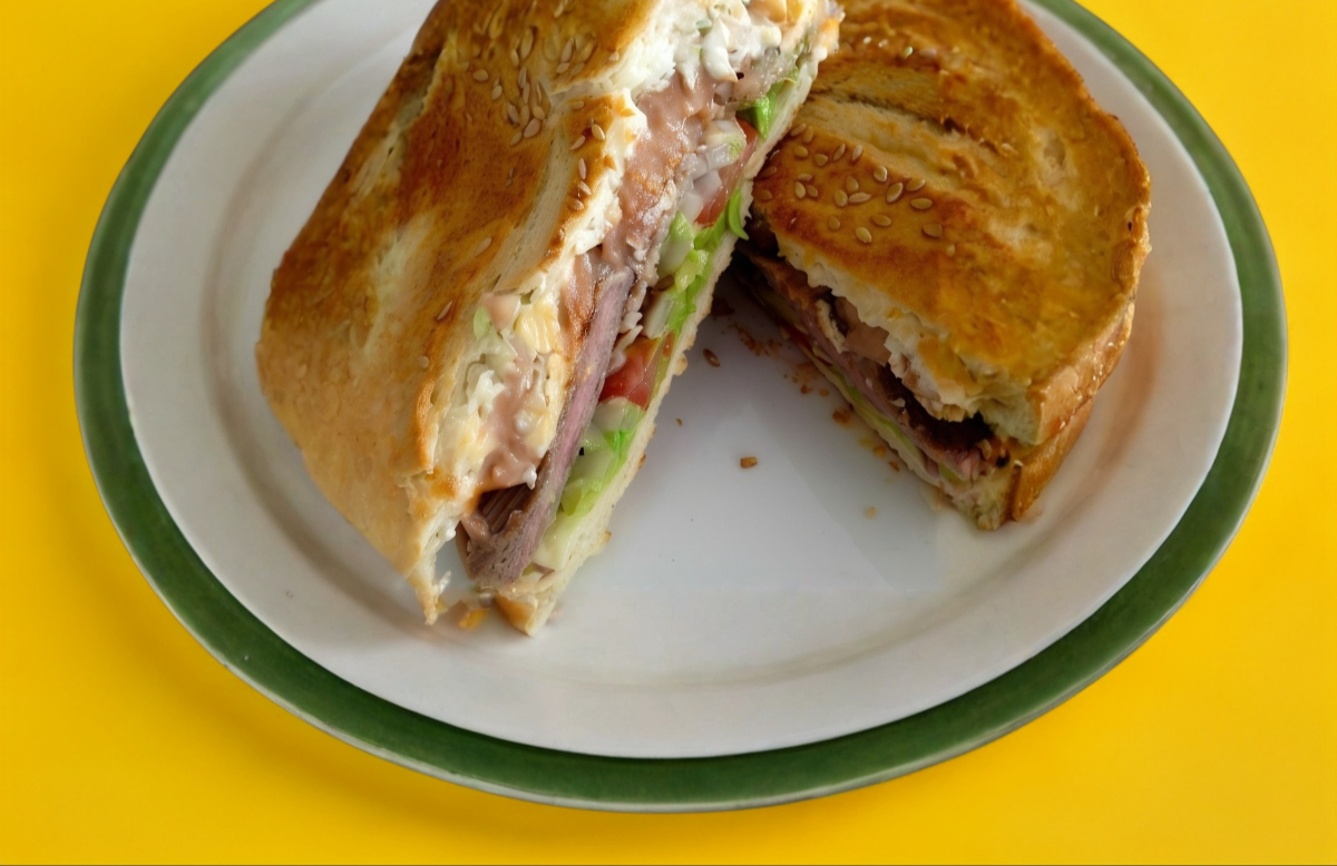 Torta de bistec, chorizo, Q. Oaxaca, frijoles, aguacate, jitomate, cebolla, salsa chipotle, mayonesa, mantequilla, chiles toreados y limones.